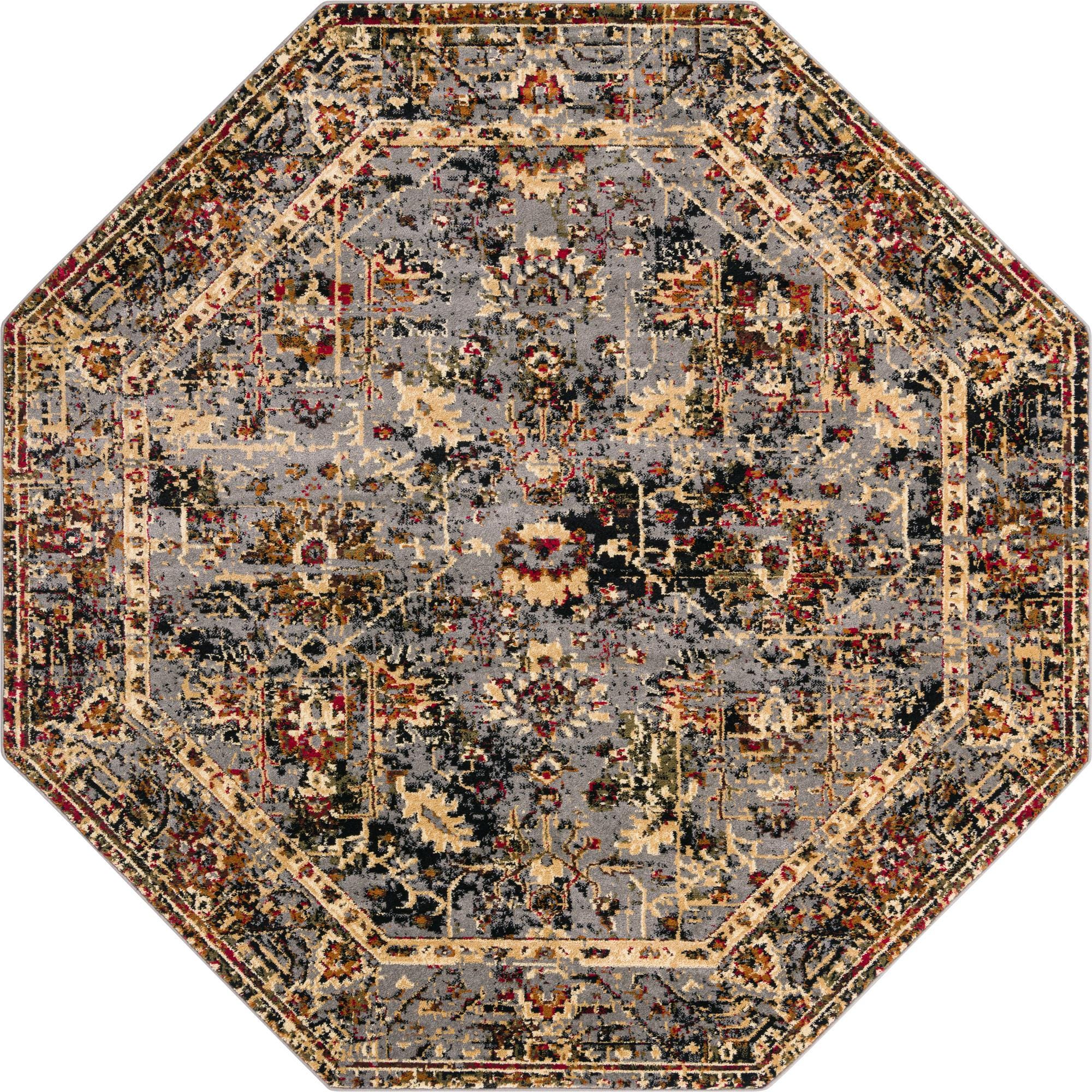 An 7' 10 x 7' 10 octagon rug from the Saturn collection, featuring a distressed traditional pattern in shades of blue, black, red, and gold.