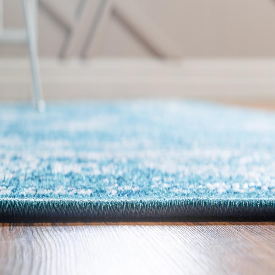 Primary color is Blue. Colors in this rug include: Blue, Gray, Ivory, Turquoise.
