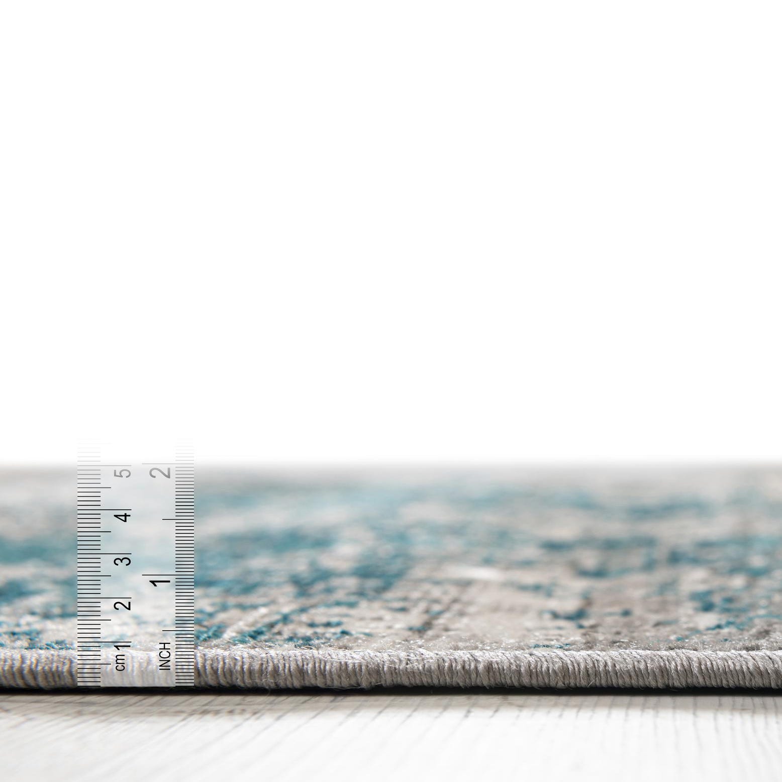 Primary color is Blue. Colors in this rug include: Blue, Gray, Ivory, Teal.
