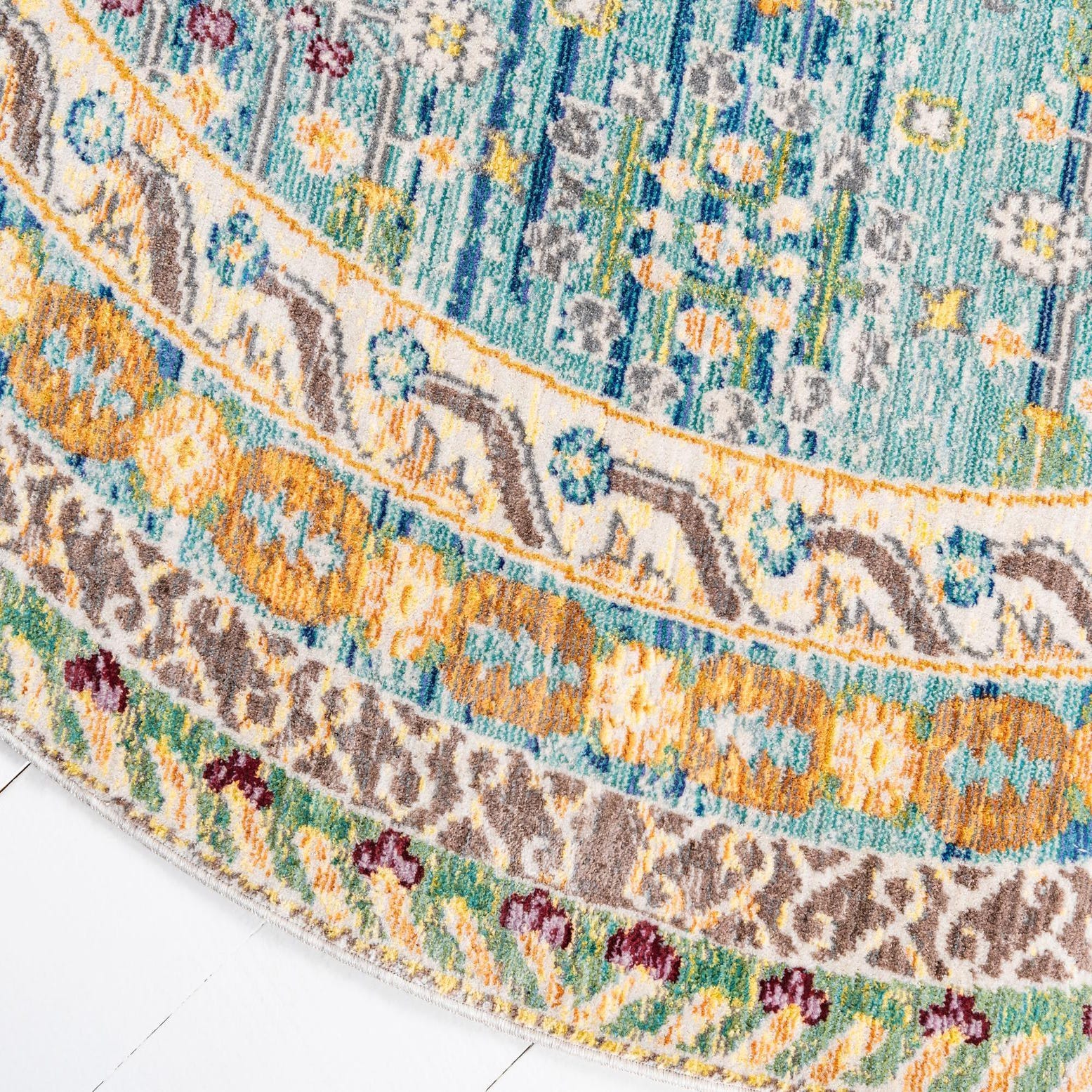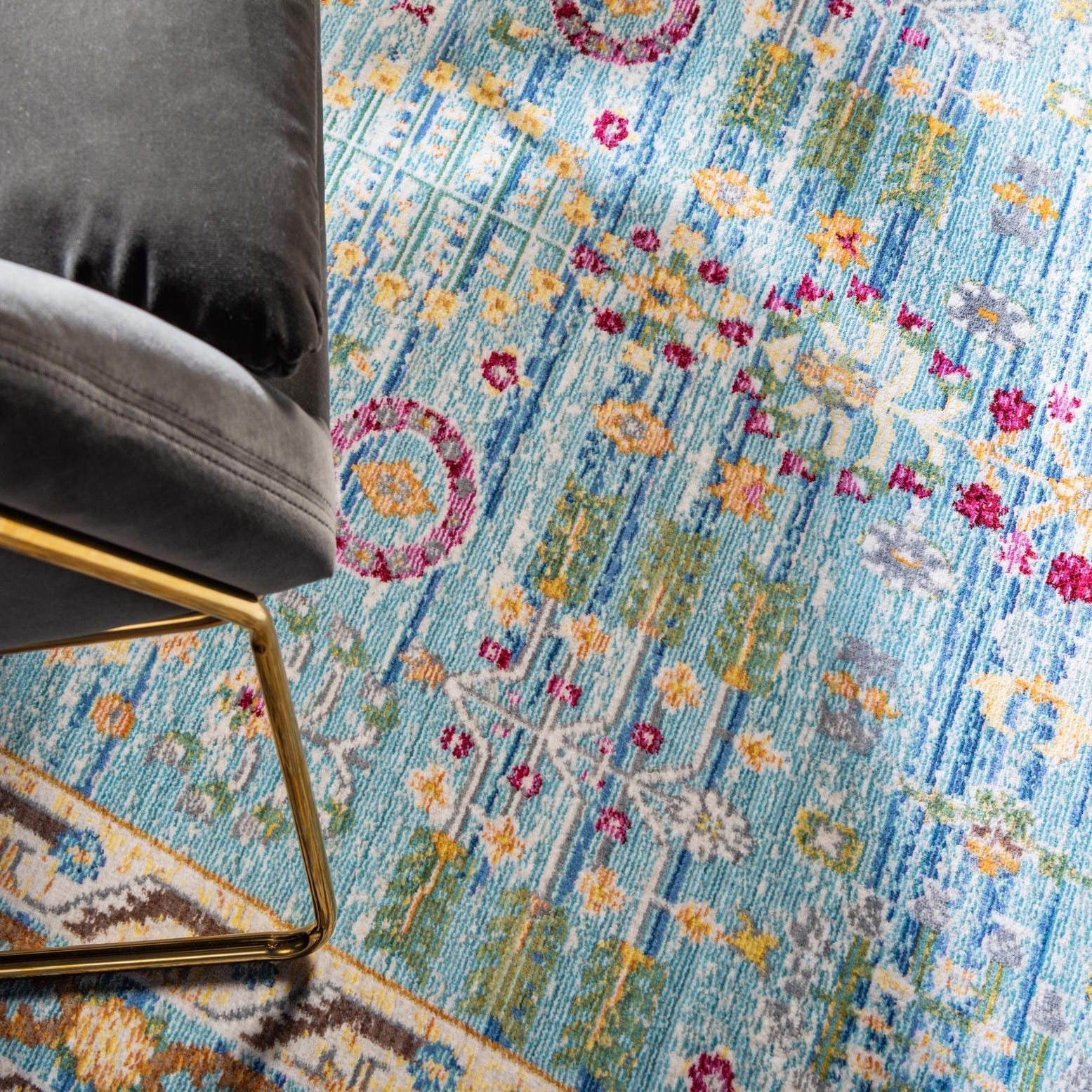 Primary color is Blue. Colors in this rug include: Blue, Brown, Green, Red, Pink, Ivory.