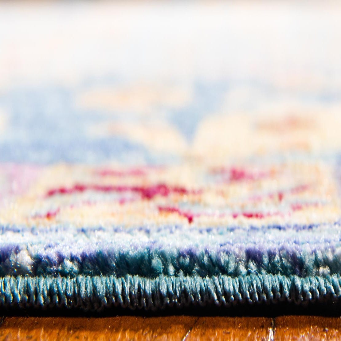 Primary color is Blue. Colors in this rug include: Blue, Gold, Gray, Green, Violet, Pink, Red.