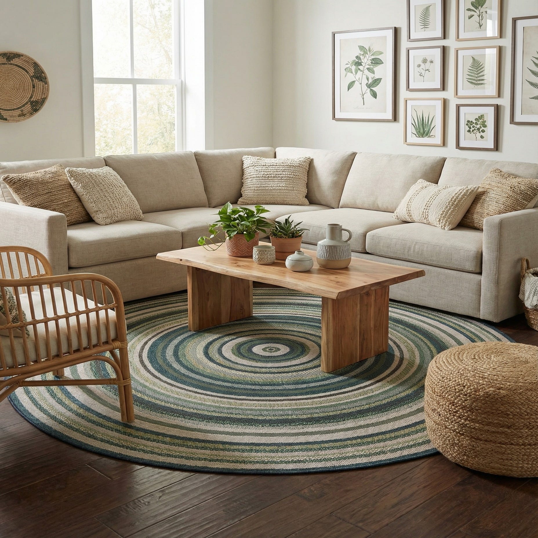 A 7' 10 round Baja Outdoor rug from Rugs.com featuring concentric stripes in shades of blue, green, and beige, suitable for a patio.