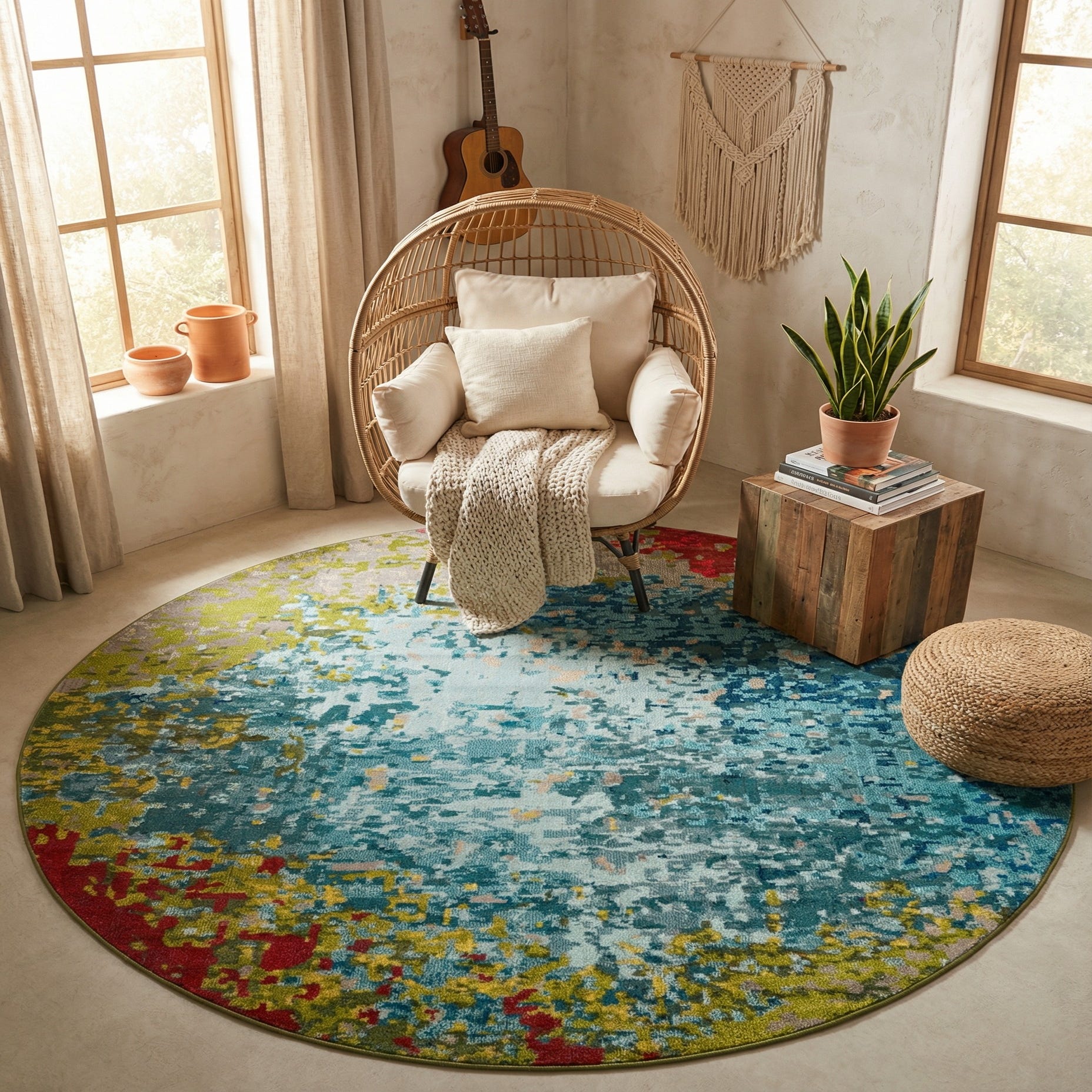 Machine made of 100% polypropylene, the rug has a low-profile pile with a soft hand and a subtle sheen that catches light across the surface. Its construction makes it a natural anchor for a modern living room or a seating nook, and it works particularly well beneath a round dining table or layered in a bedroom to introduce color and texture. Pair it with warm wood tones and muted linens for a relaxed, coastal-inspired look, or layer it with mid-century furniture and brass accents for a lively, contemporary setting.