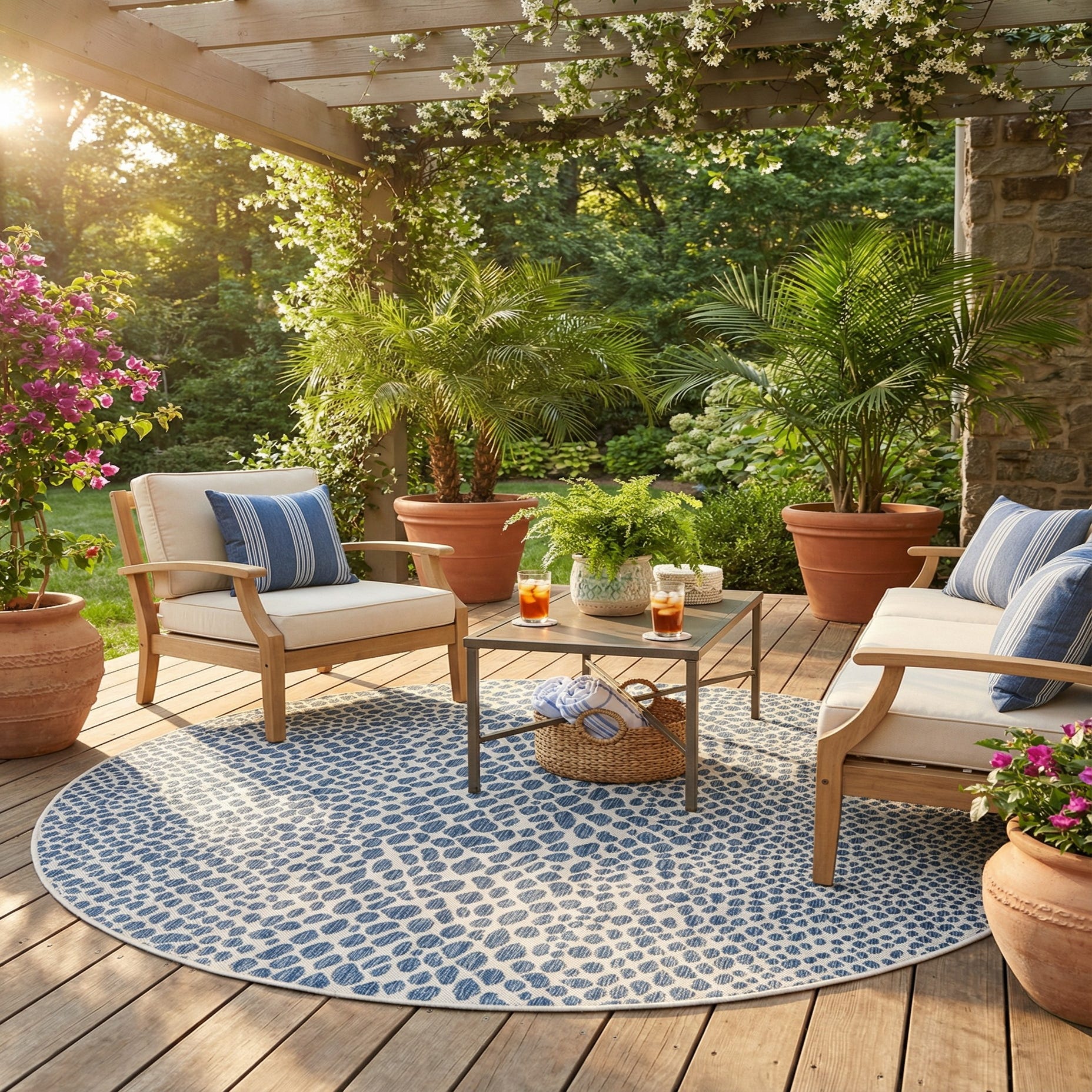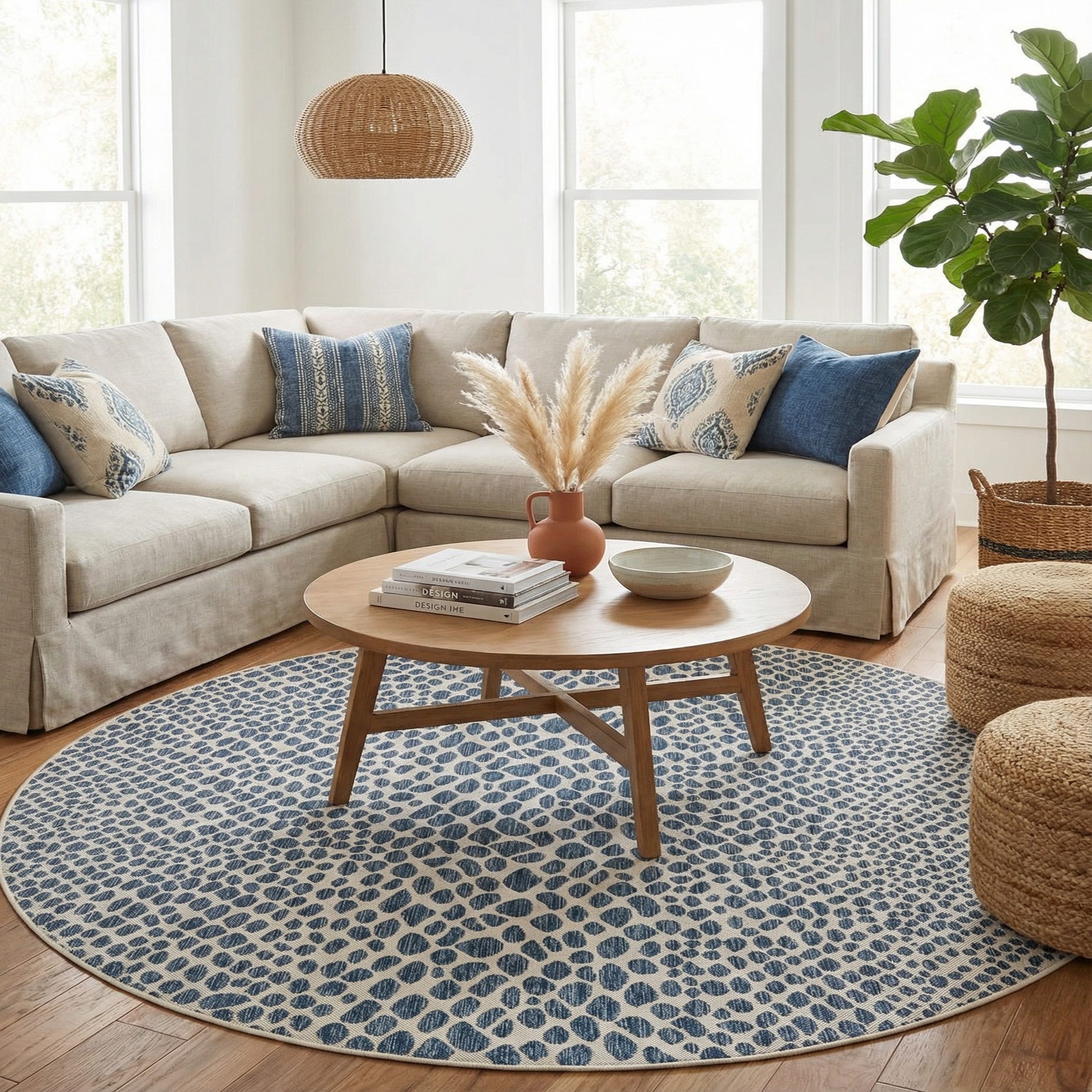 The circular shape is ideal for anchoring conversation areas or softening a dining nook; place it under a round table on a covered patio or in a casual living room to introduce pattern and contrast. It pairs naturally with white or natural-finish wicker, teak or bleached woods, navy textiles, and rattan or seagrass accents for a relaxed coastal or modern-transitional look.