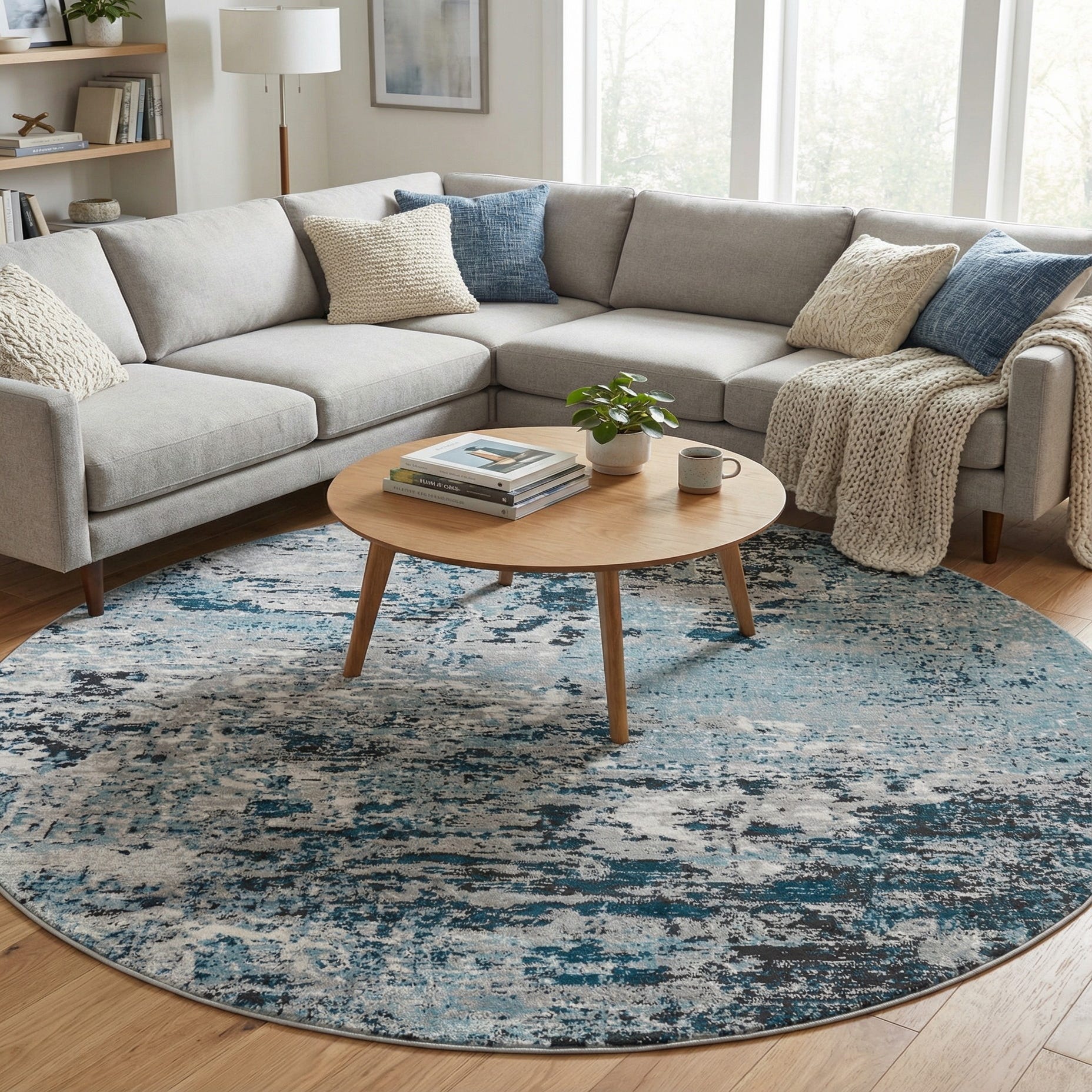 Pair this round rug with a light-wood dining table or a small seating group to anchor the layout and add visual interest. It also works well in coastal-inspired rooms, cool-toned living spaces, or bedrooms where layered textures and calming blues are desired. The color palette coordinates easily with gray or ivory upholstery and brushed-metal accents for a cohesive, relaxed scheme.