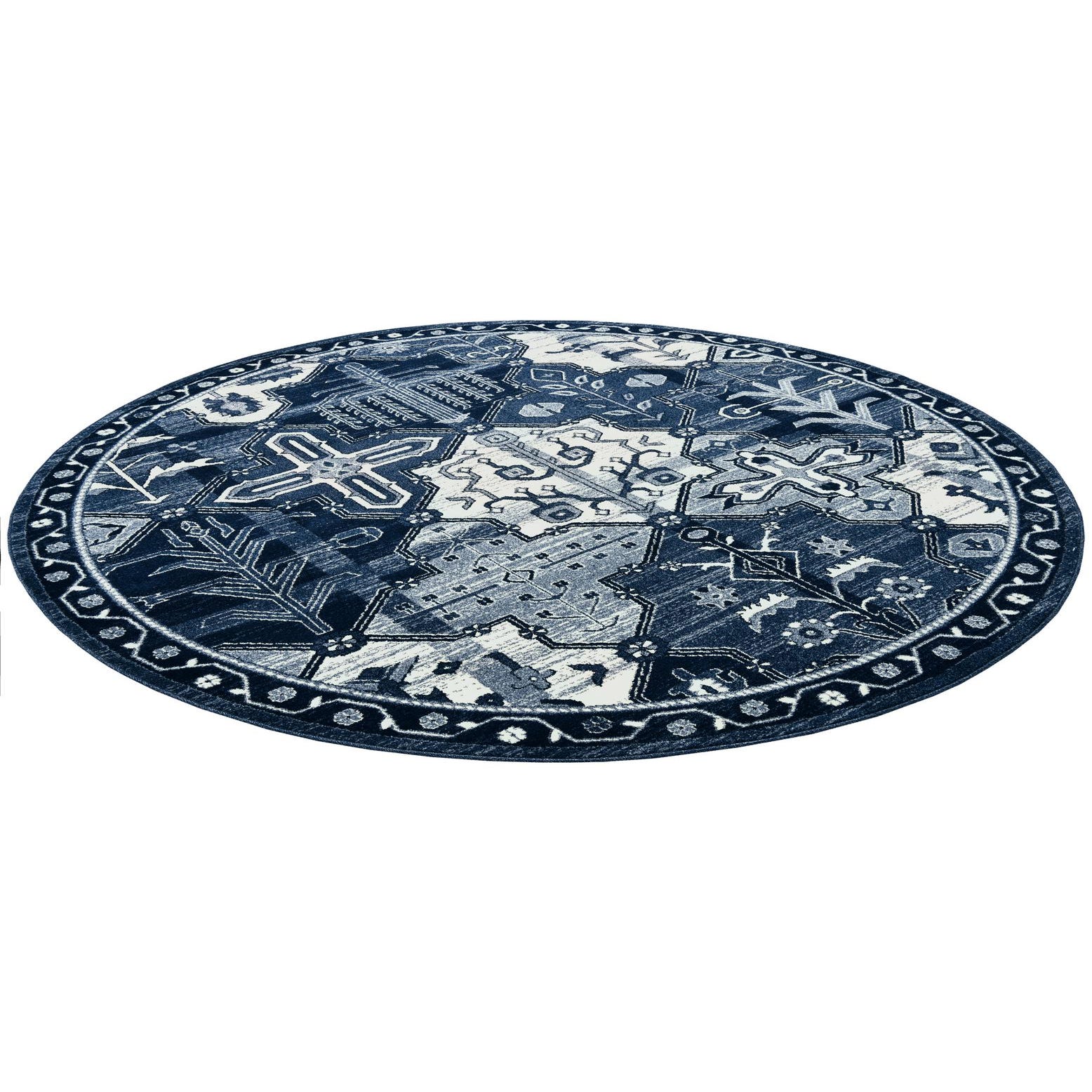 The Miranda Collection offers a machine-woven 8 Ft Round rug crafted from 100% polypropylene, delivering durability and longevity. This particular rug features a rich palette of blue, including shades from light blue to navy blue, with ivory accents creating a striking contrast. The background of the rug is predominantly blue, giving it a deep and serene foundation.