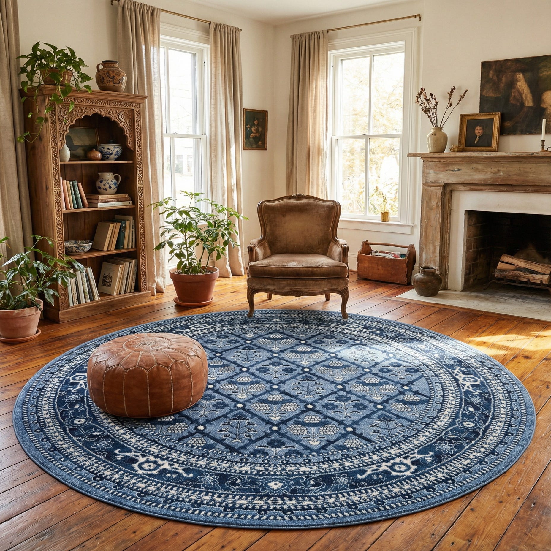 A classic, circular rug with a traditional medallion and trellis-inspired pattern, this piece pairs layered floral motifs with a geometric lattice for a balanced, timeless look. The background is blue, punctuated by navy blue outlines, light blue shading, and ivory highlights that define the small floral clusters and ornate border. Machine made from 100% polypropylene, the surface has a low, dense pile with a smooth hand and a subtle, durable finish that holds the pattern’s crisp details.