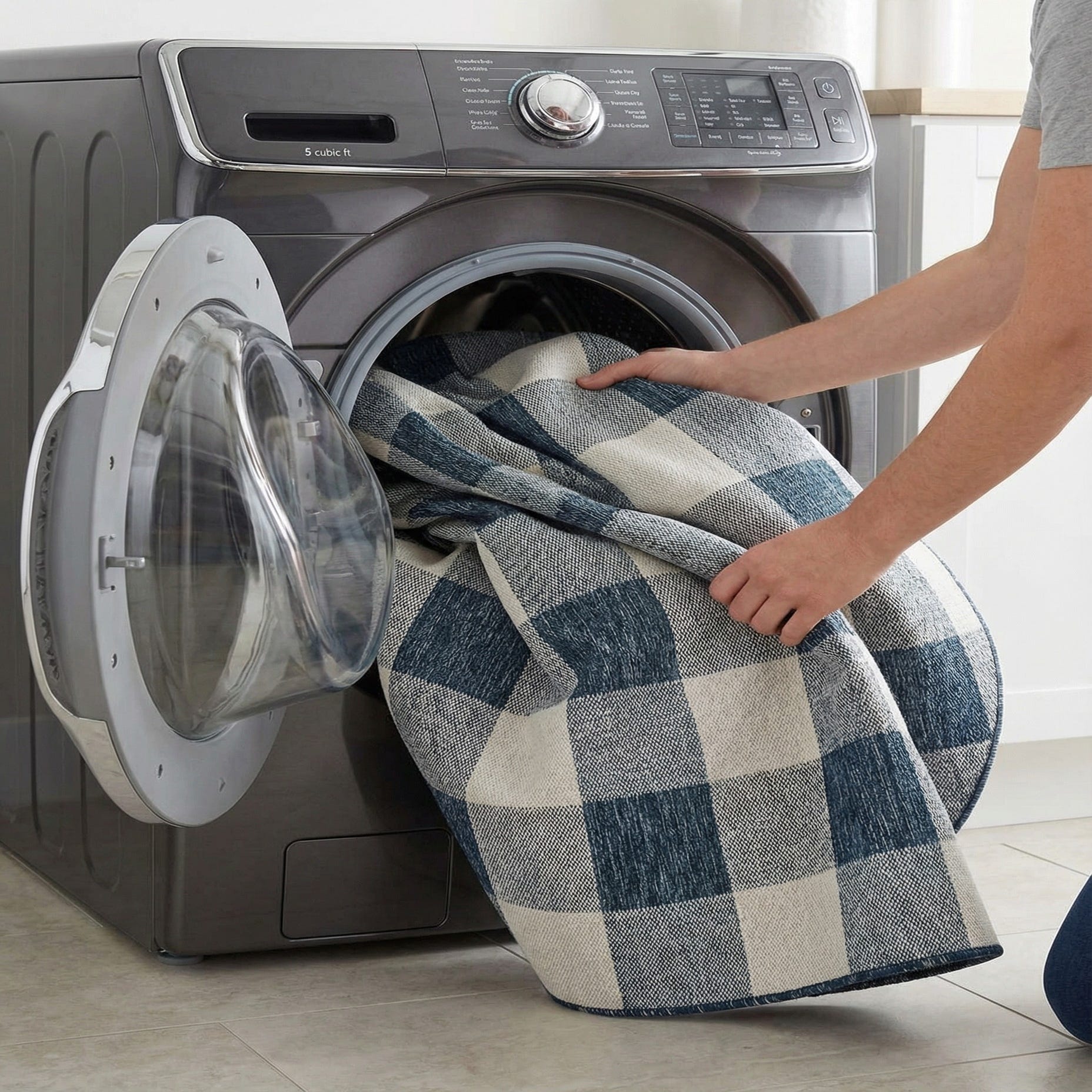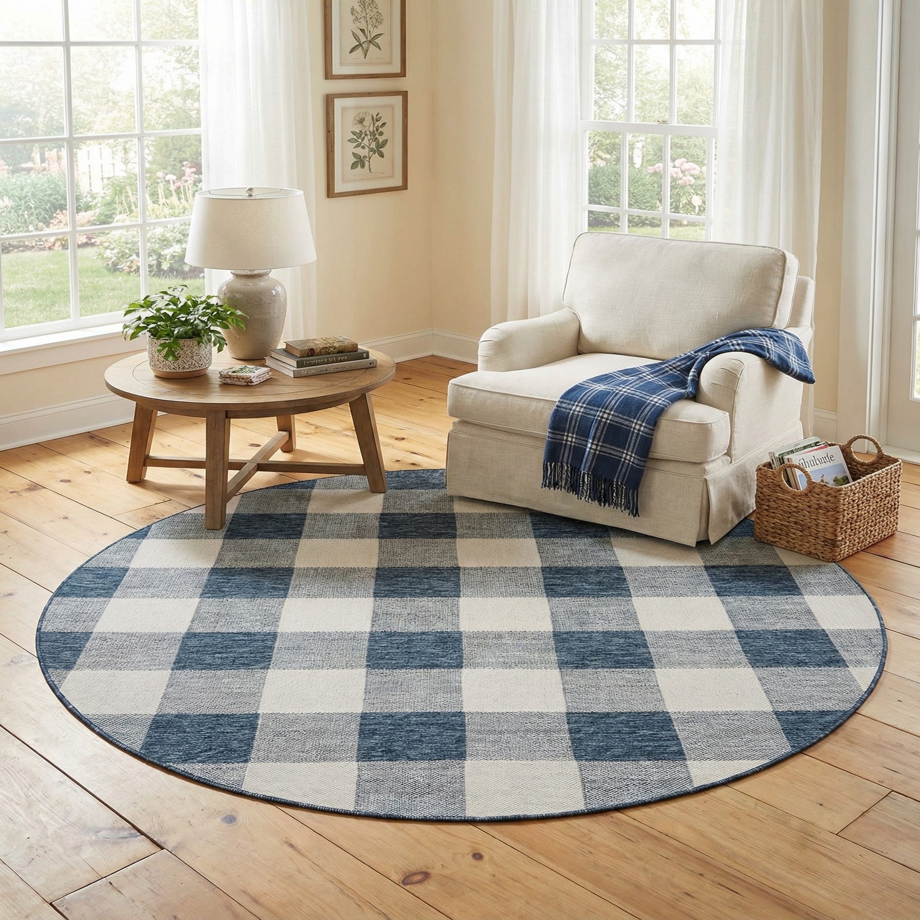 A classic checkered design in rich blue and soft cream gives this round rug a clean, familiar look. The oversized buffalo-check pattern is rendered with subtle striations in the yarn, creating a woven, slightly slubbed surface that looks hand-crafted while staying structured. Machine made from 100% polypropylene, the flat-woven face has a low profile and a firm, tactile feel underfoot—soft enough for bare feet yet durable in appearance.