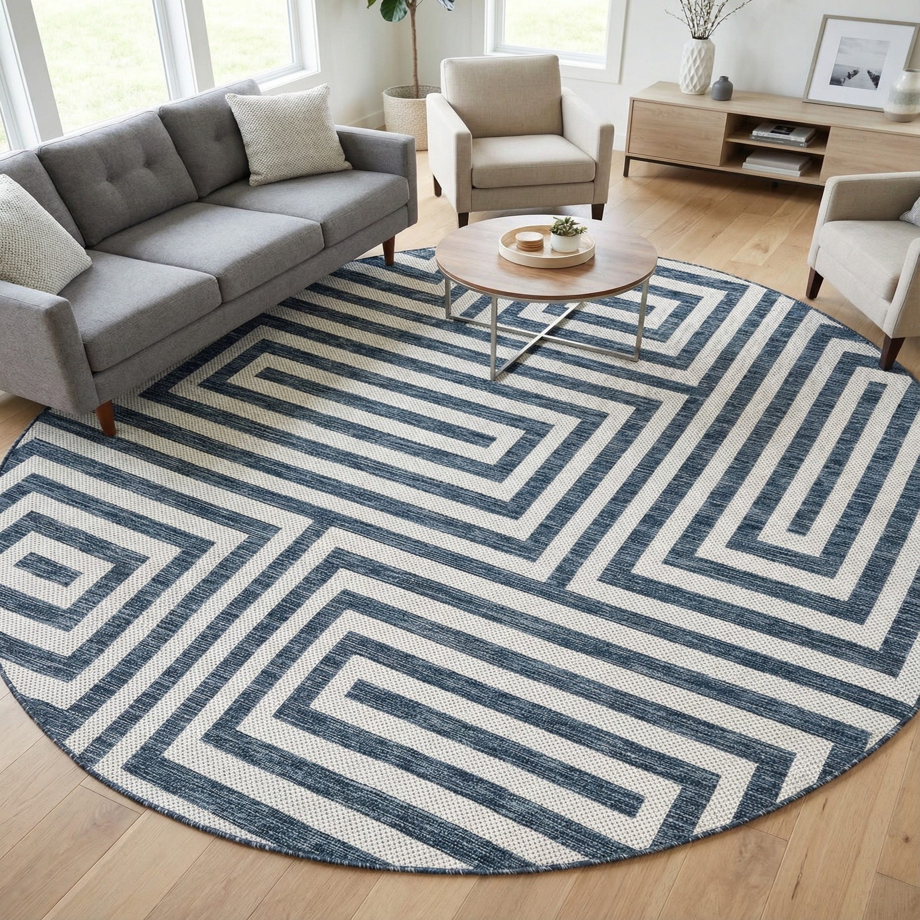 The clean blue-and-ivory palette pairs naturally with coastal, contemporary, or minimalist settings—think warm wood furniture and white trim or sleek metal accents. Place it under a round bistro set on a covered patio, define a conversation area in a sunroom, or anchor a compact dining area to bring structure and a fresh, modern rhythm to the space. Durable polypropylene construction makes this rug a practical choice for outdoor spaces and high-traffic rooms while maintaining a polished, modern look.