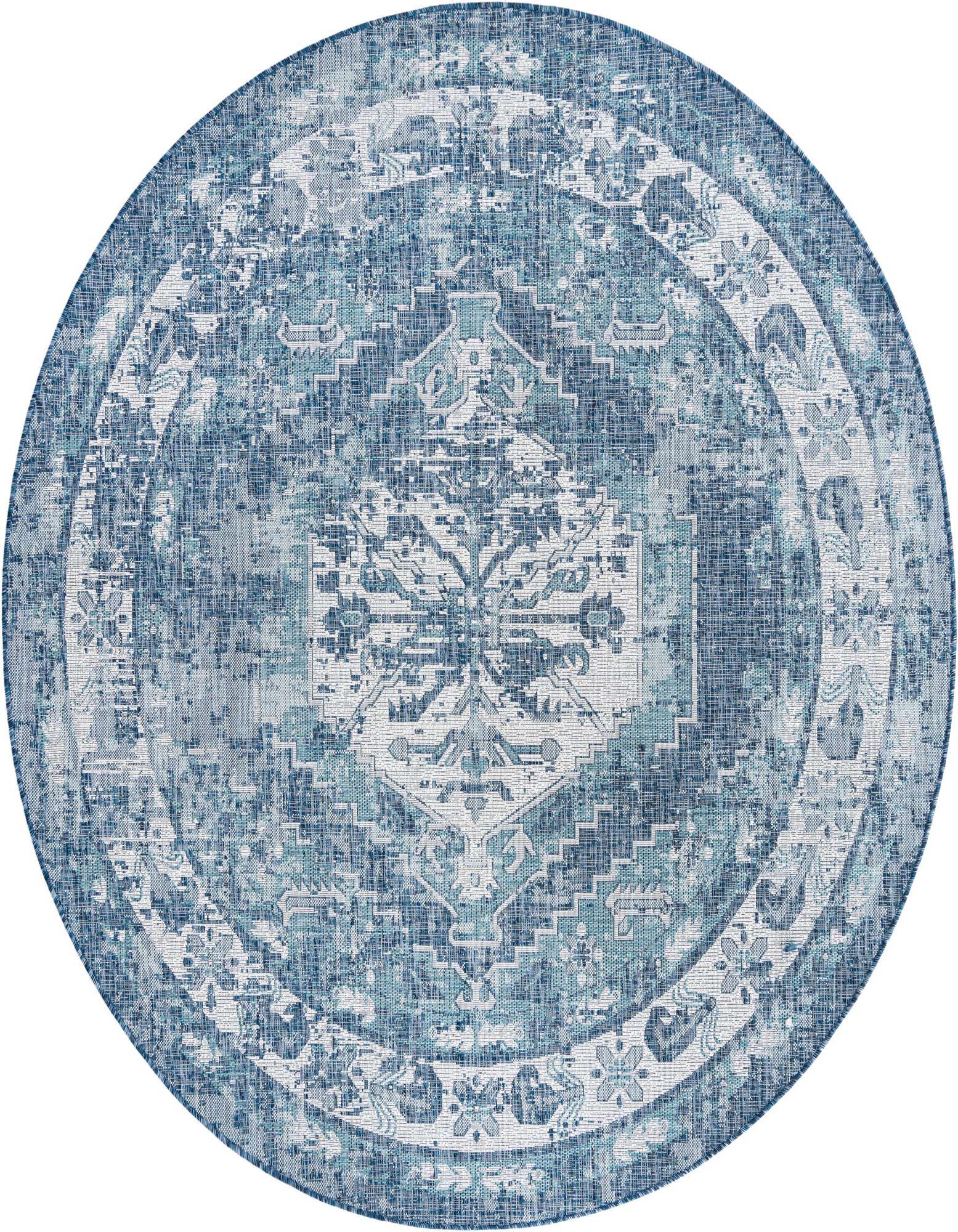 This Outdoor Traditional collection rug presents a sophisticated take on traditional design, with a central medallion pattern rendered in a harmonious palette of blue, gray, ivory, and light blue on a blue background. The rug features a machine-woven construction of 100% polypropylene, ensuring durability and ease of maintenance. Its 8-foot round shape makes it a versatile choice for a variety of settings.