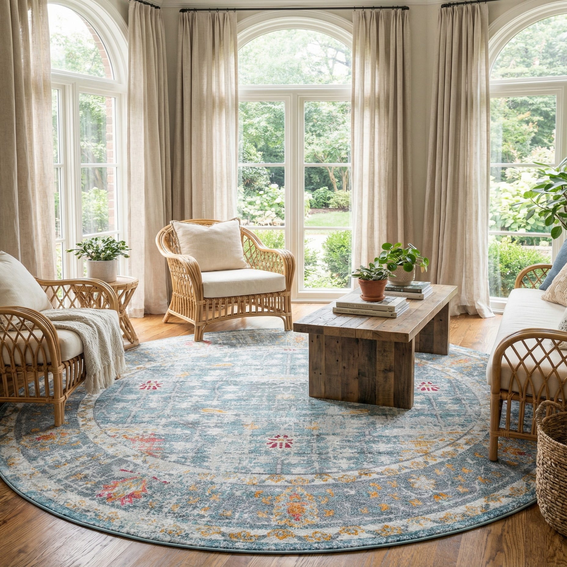 The rug has a low, dense pile with a smooth, slightly lustrous hand typical of synthetic construction. Machine made from 100% polypropylene, it delivers a tightly woven texture that lies flat under furniture and preserves the clarity of the pattern. Well-suited for transitional or coastal-inspired interiors, it works nicely under a round dining table, anchors a living room seating area, or adds color and pattern to a bedroom. Pair it with light wood or painted furniture, linen upholstery, and metal accents in brass or matte black to balance the cool blues and the warm red-orange pops.
