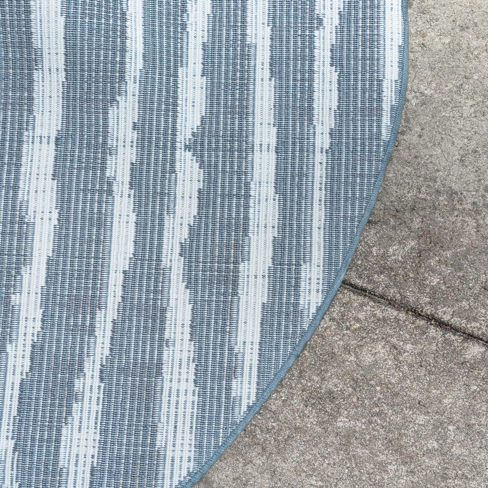 A round 8' blue and white modern striped indoor/outdoor rug with a textured high-low pile.