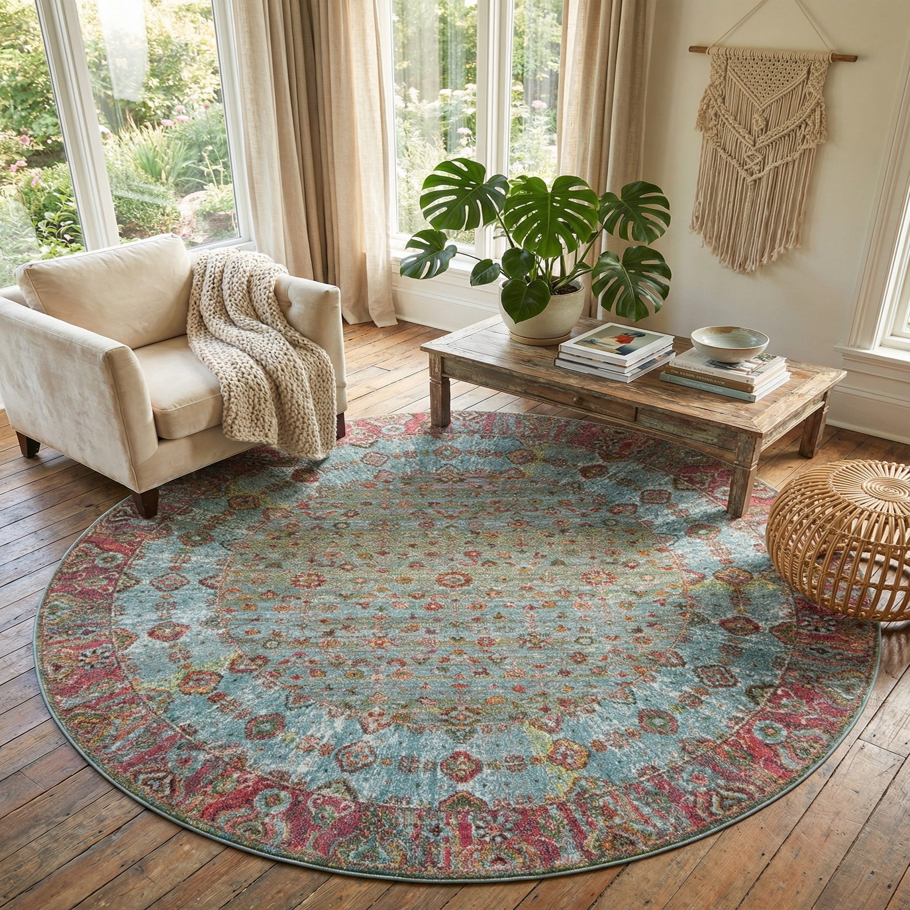 Machine made from 100% polypropylene, the surface feels smooth and slightly velvety underfoot with a low-profile pile that lays flat in high-traffic areas. Its balanced mix of warm and cool hues works well with neutral sofas, coastal palettes, or eclectic boho schemes; place it beneath a round dining table to anchor a breakfast nook, center it in a seating group to encourage conversation, or layer it over hardwood in a bedroom for added color and texture.