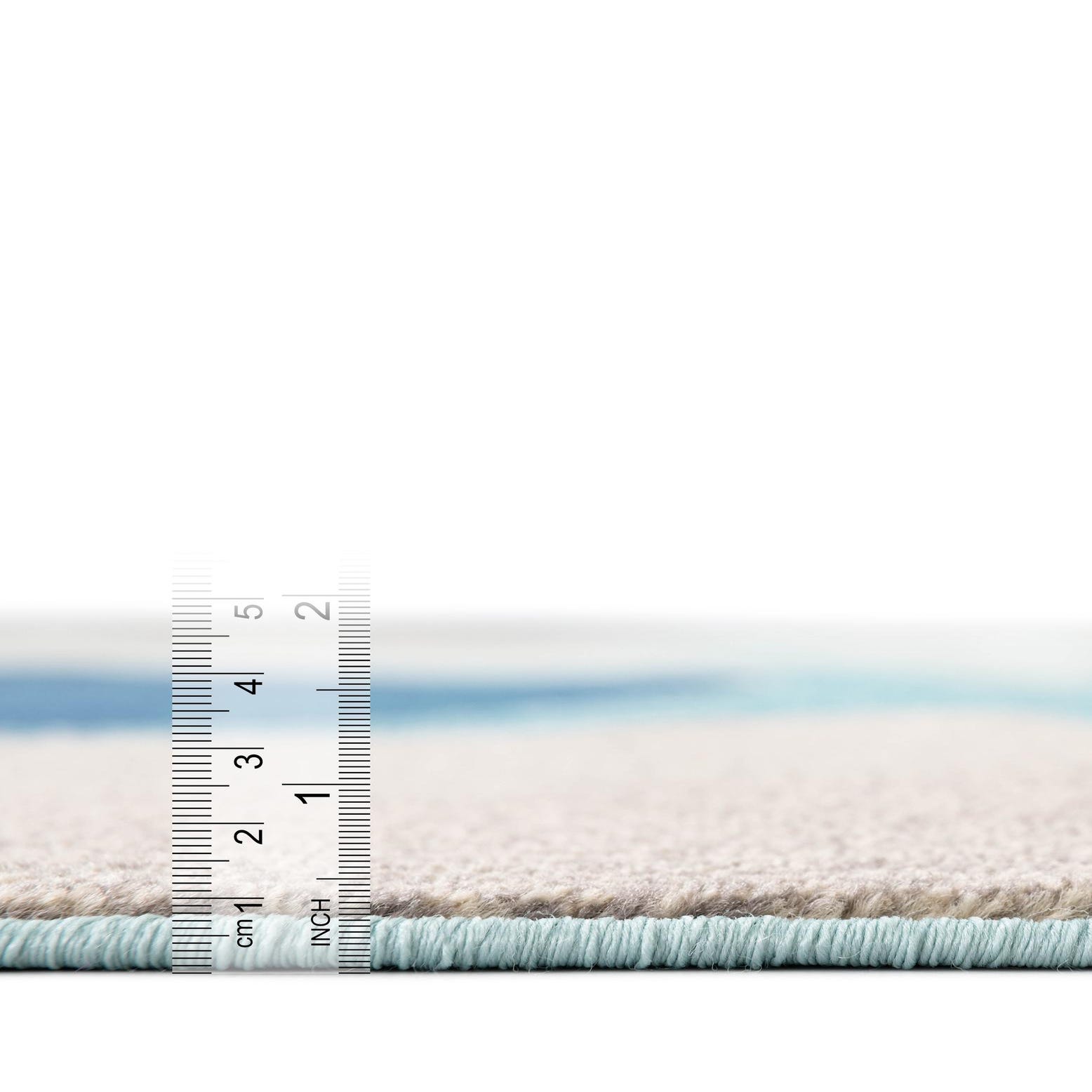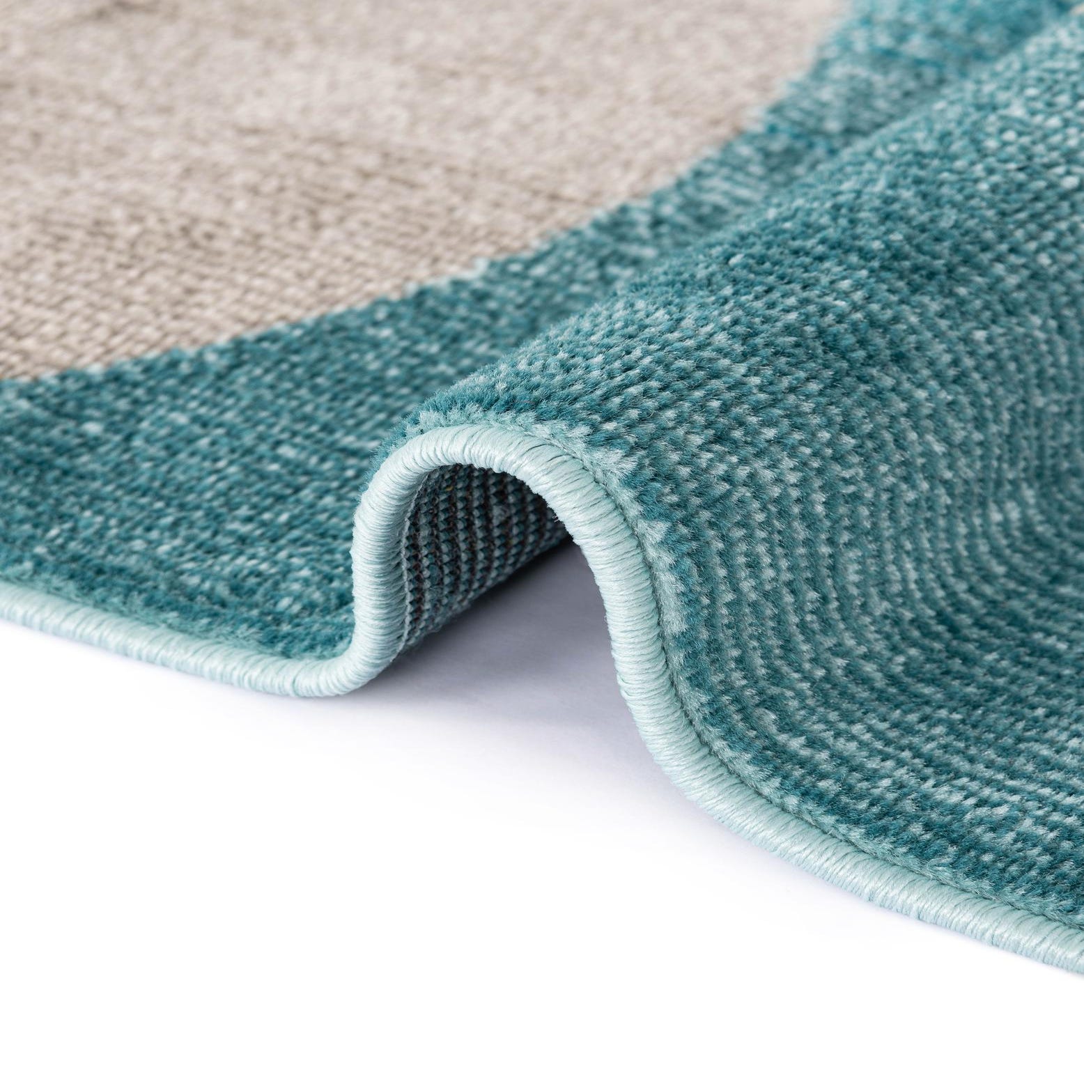 A bold geometric design of overlapping circles sits against a blue field, combining navy blue, light green, beige and brown in layered, interlocking rounds. The pattern reads modern and graphic, with softer beige and light-green tones balancing deeper navy and brown accents. Machine made of 100% polypropylene, the rug has a low-pile, smooth surface that presents color clearly and offers a restrained sheen where light catches the weave.