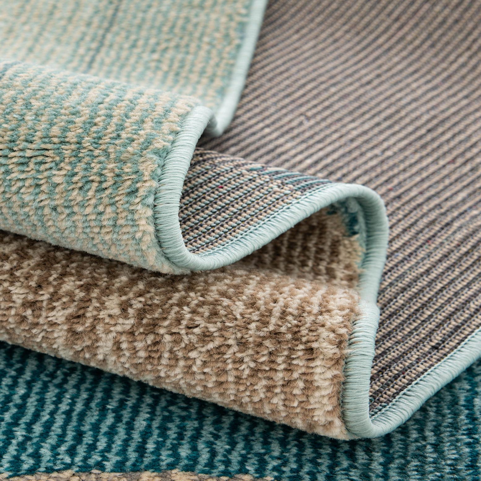 Primary color is Blue. Colors in this rug include: Blue, Beige, Brown, Light Green, Navy Blue.