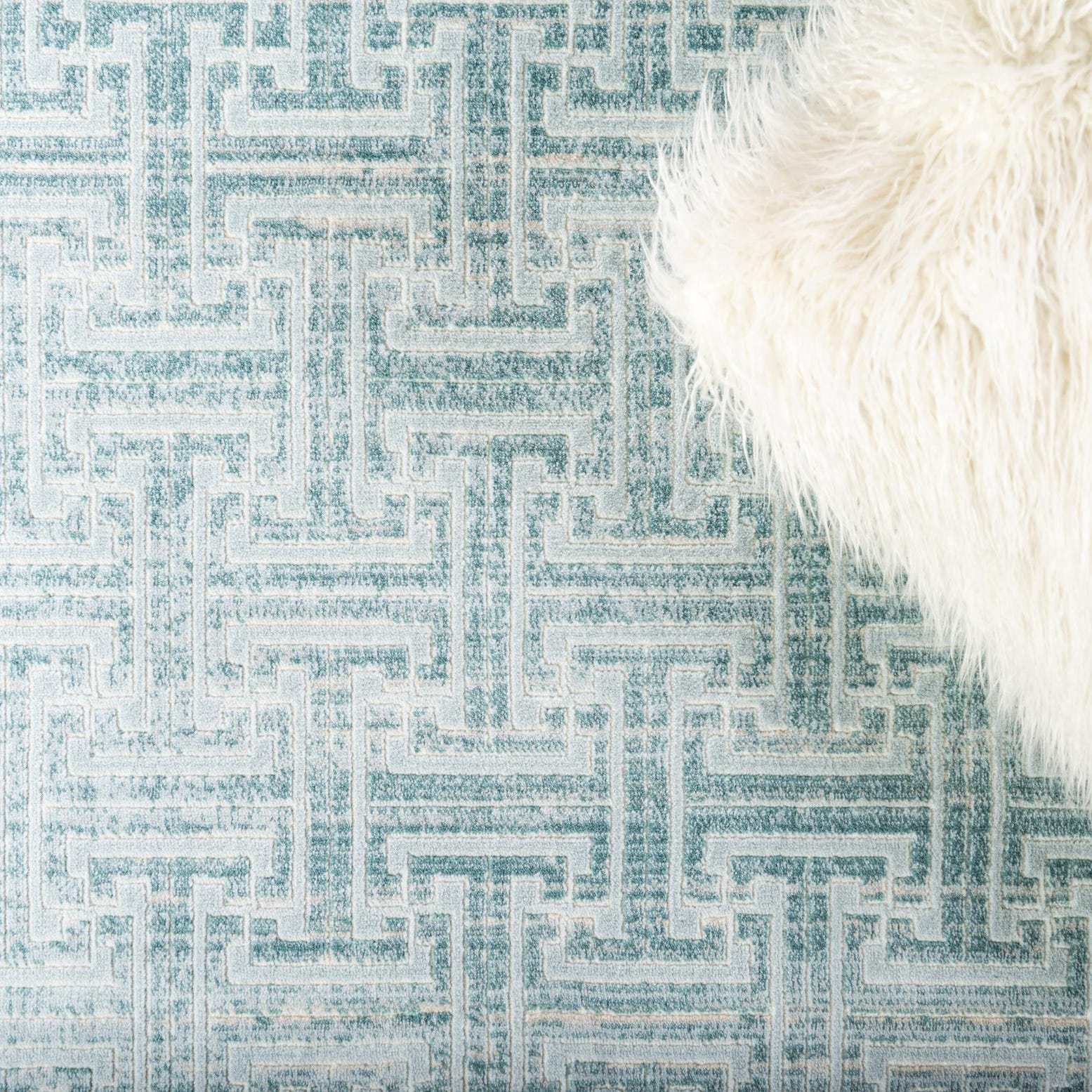 A crisp geometric trellis unfolds across a blue ground, where light-blue interlocking motifs create a subtle lattice that balances structure with softness. The surface has a low, dense pile that feels smooth underfoot, with a faint, slightly satiny sheen from the polyester fibers and resilient bounce from the polypropylene. Machine-made construction of 70% polypropylene and 30% polyester delivers a consistent pattern and a finely defined, slightly distressed finish that adds visual depth without overpowering a room.