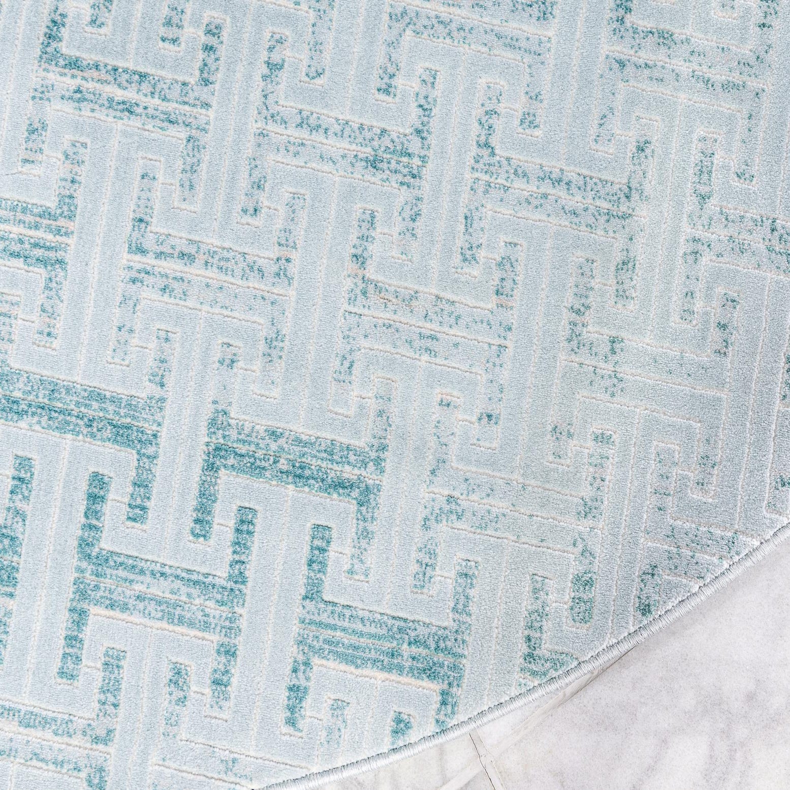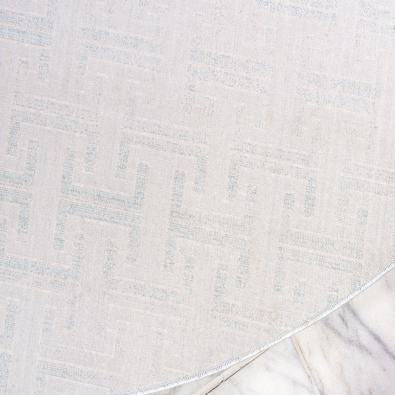 This round piece works well beneath a circular dining table, centered in a conversation area, or layered in a bedroom or reading nook to introduce pattern without heavy contrast. It complements coastal, contemporary, or transitional schemes—pair it with natural woods and linen upholstery for a relaxed look, or with clean-lined furniture and metallic accents for a more modern setting.