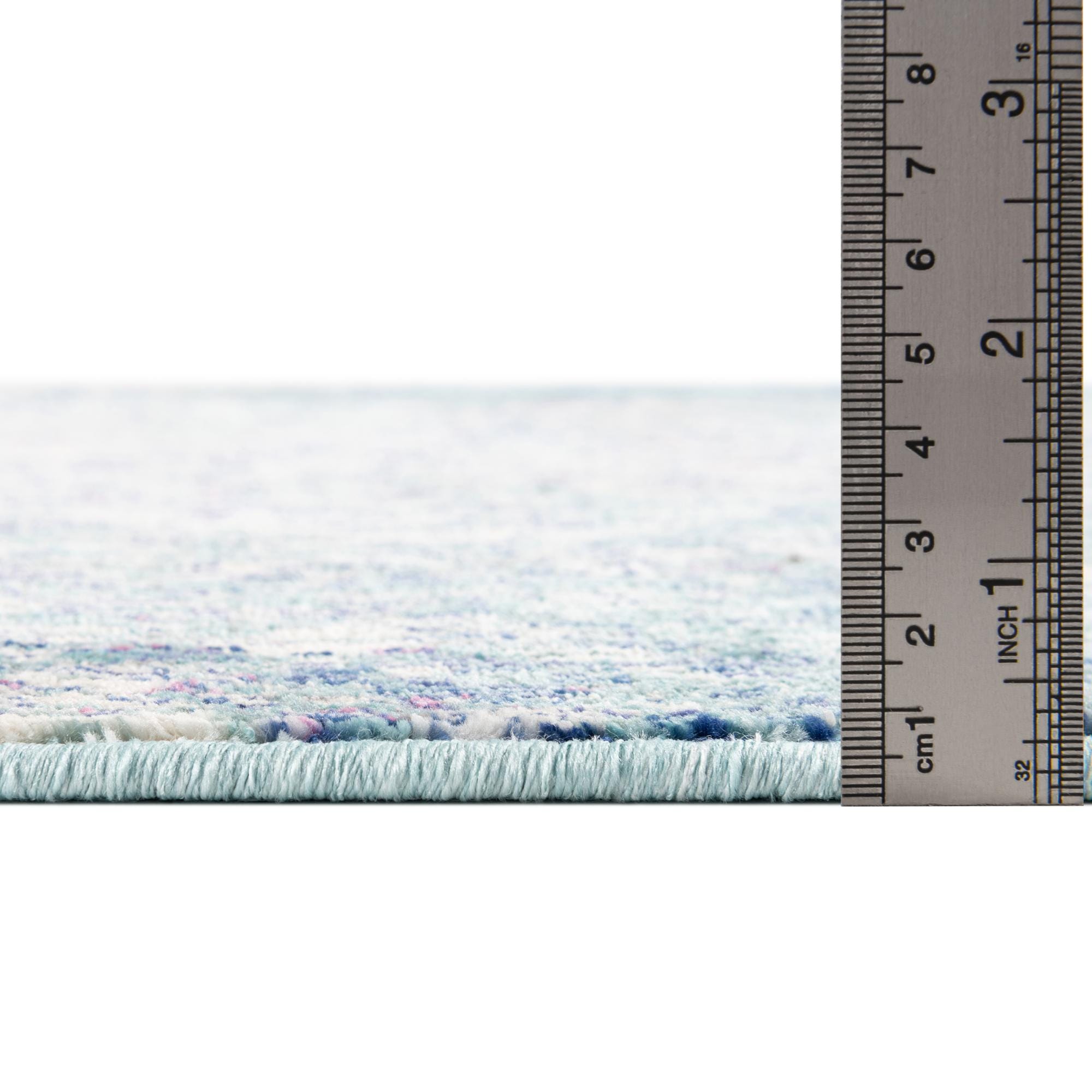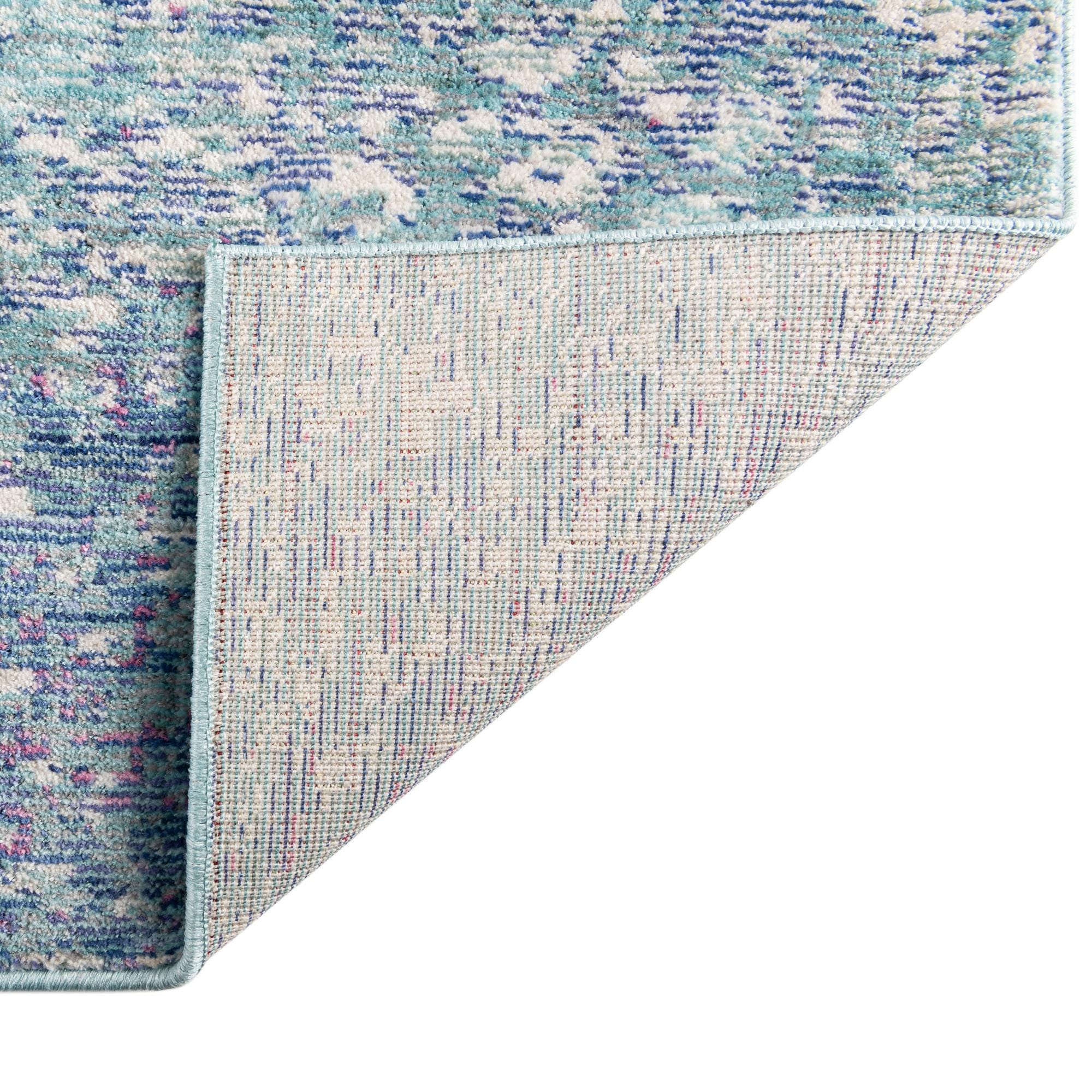 Primary color is Blue. Colors in this rug include: Blue, Ivory, Light Blue, Navy Blue, Violet.