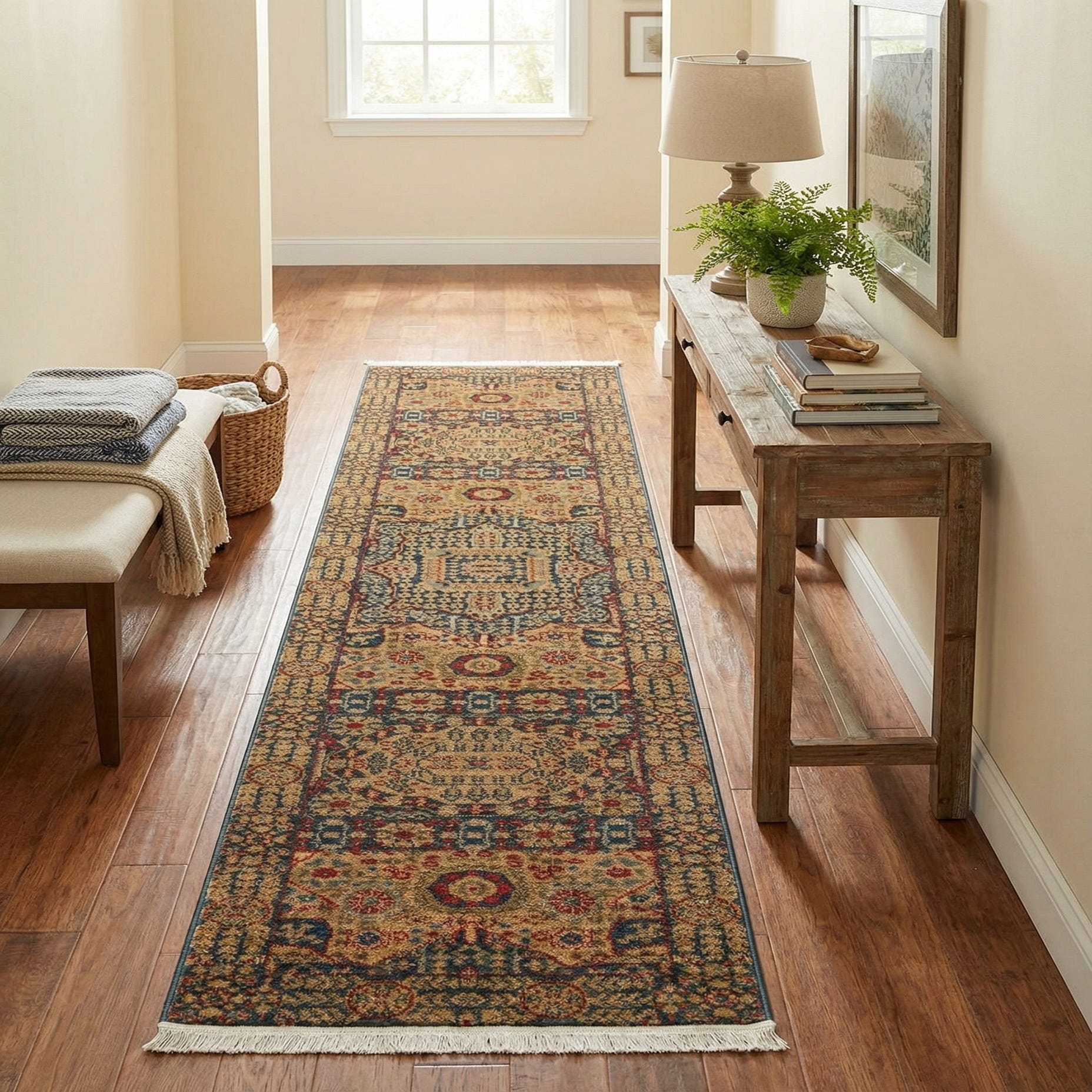 Machine made from 100% polypropylene, the rug has a low-to-medium pile with a tight, even construction that feels smooth and substantial underfoot. The synthetic fibers hold the pattern crisply while offering a soft, slightly lustrous surface. Use it to anchor a hallway or entry for a traditional or transitional home, layer it along a kitchen runner space, or place it in a narrow living area to introduce pattern and color without overwhelming the room. It pairs well with warm wood floors, leather or upholstered seating in neutral tones, and brass or aged metal accents for a pulled-together look.