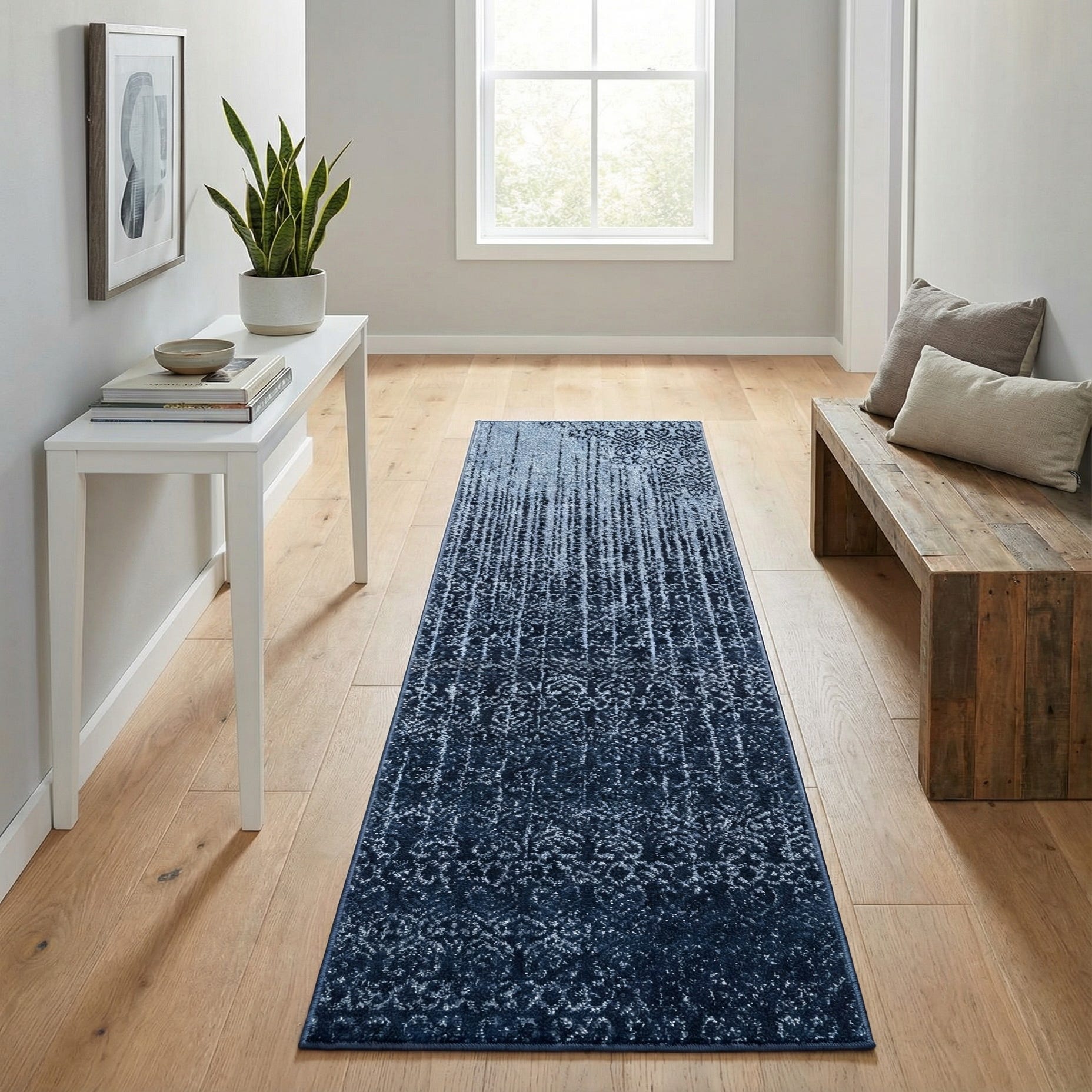 The Angelica Collection offers a tastefully artistic update for any home with its contemporary pattern and deep color palette. This 8-foot runner features a navy blue and blue design set against a predominantly blue background, creating a serene yet expressive focal point for your hallway or living space. The dynamic distressed pattern provides a modern twist making it suitable for transitional and contemporary interiors. The rug is crafted using machine-woven 100% polypropylene, ensuring durability and stain resistance.