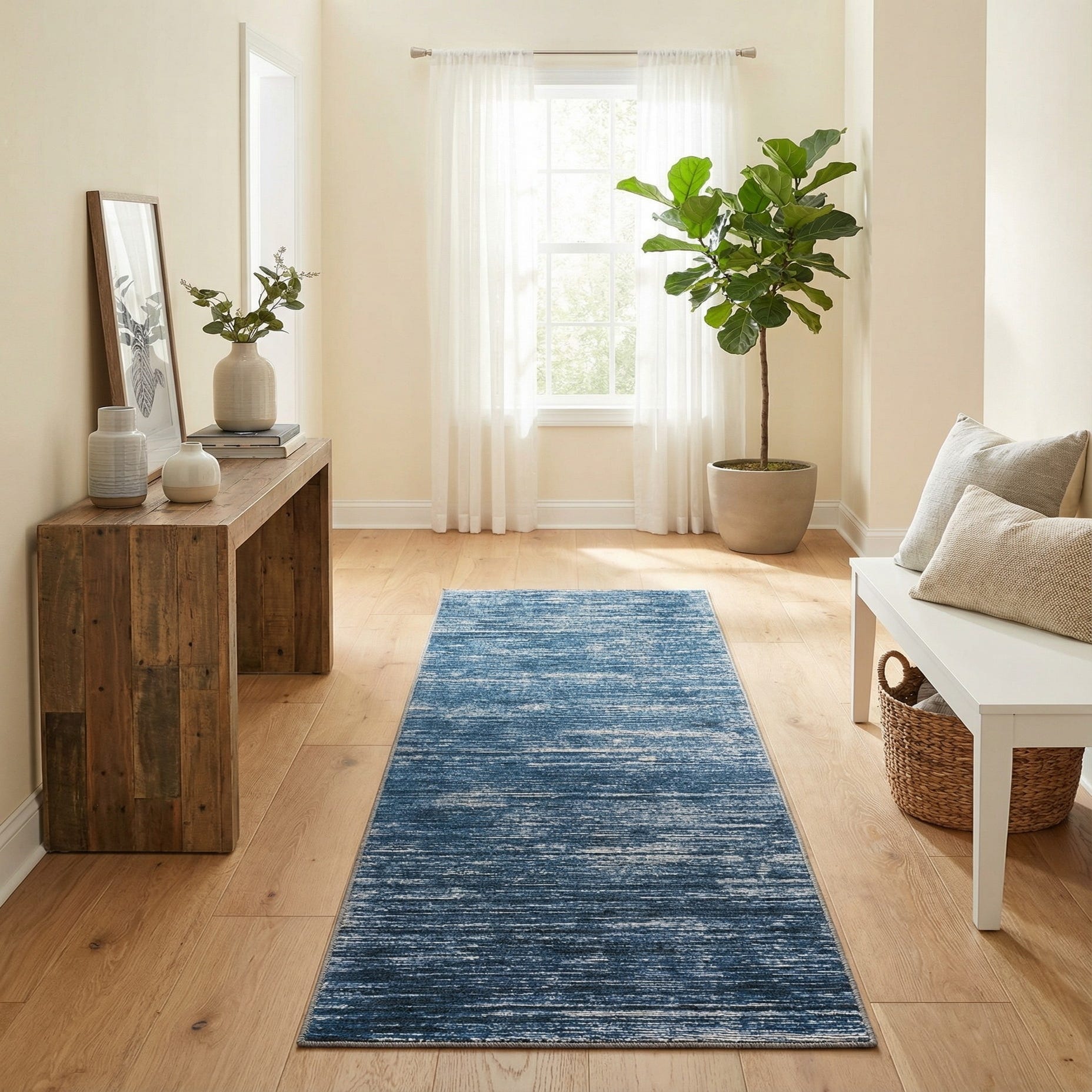 A long 8 ft runner rug from the Asha collection, featuring a modern blue and white textured stripe pattern.