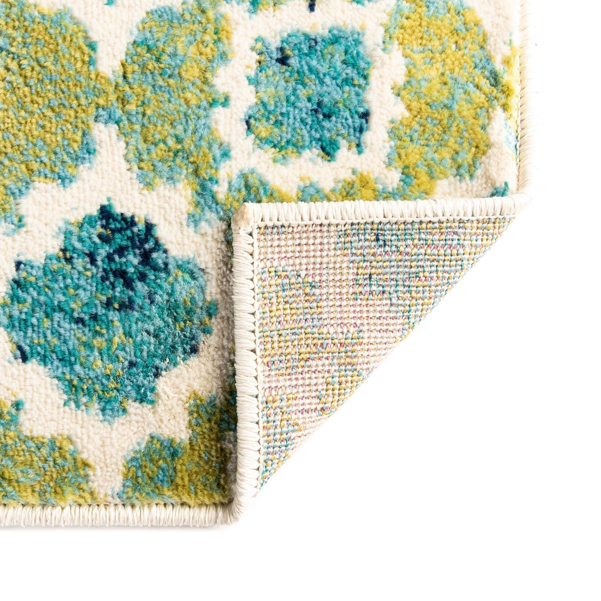 A repeat medallion pattern gives this runner a lively, geometric rhythm. The background is blue, while ivory, green and navy blue form layered, quatrefoil-like motifs that alternate across the length of the rug. Color shifts within each motif create a painterly, slightly mottled effect that adds depth without overwhelming the pattern.