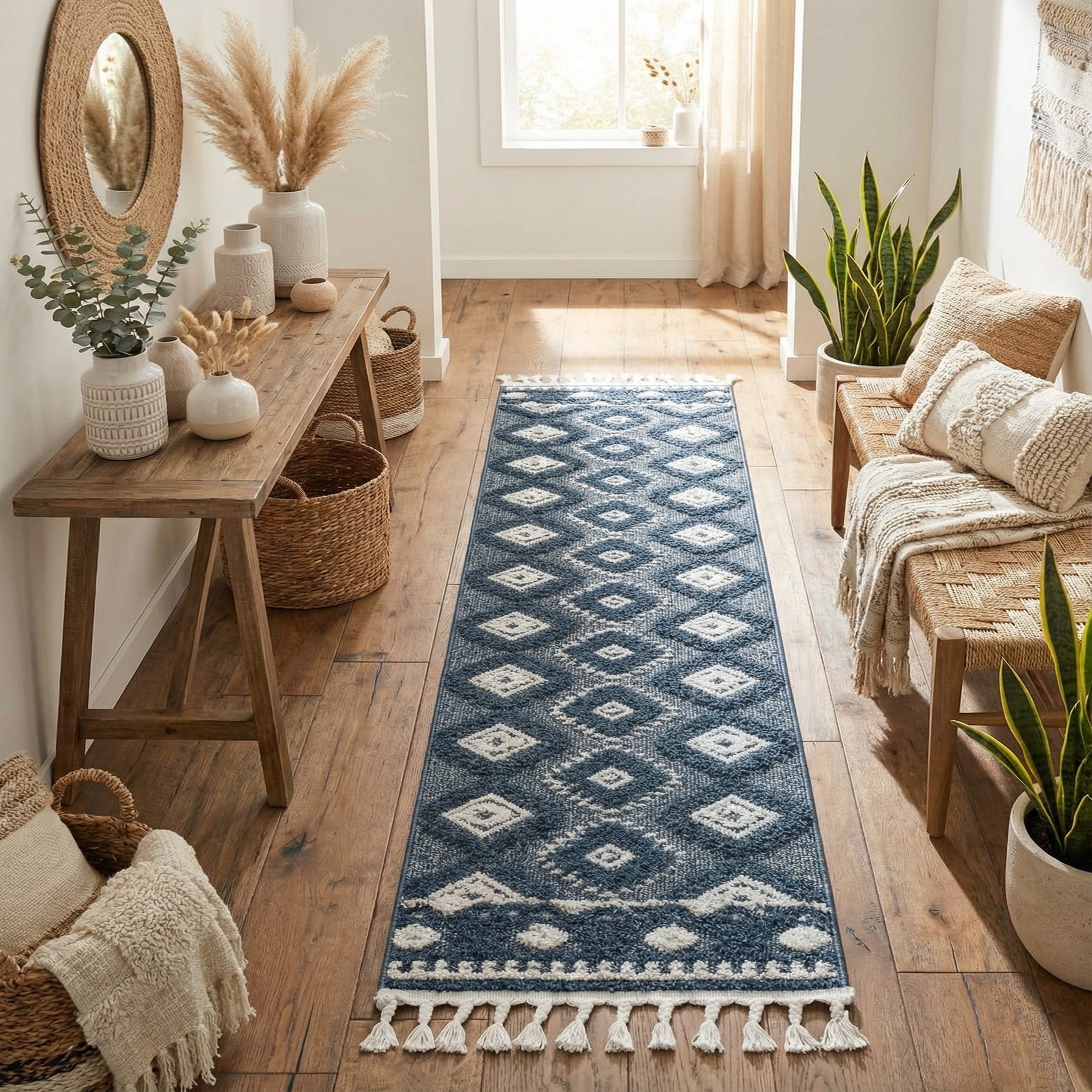 A long blue and white runner rug featuring a textured bohemian tribal pattern with diamonds and tassels, ideal for a hallway.