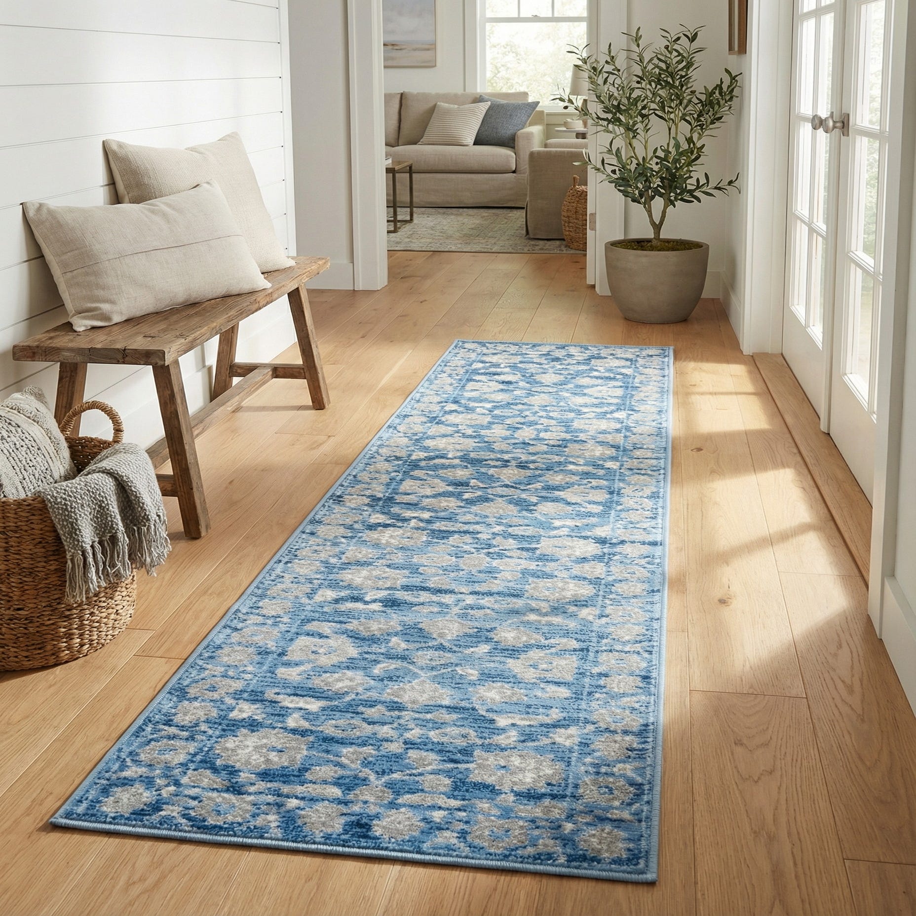 Machine-made from 55% polypropylene and 45% polyester, this runner combines a soft, velvety hand with durable performance. A blue background anchors a repeating floral medallion motif in ivory and gray, with subtle distressed shading and slightly elevated pile areas that create gentle depth and texture underfoot. The polyester lends a soft sheen to the floral highlights while the polypropylene keeps the surface resilient for everyday traffic.