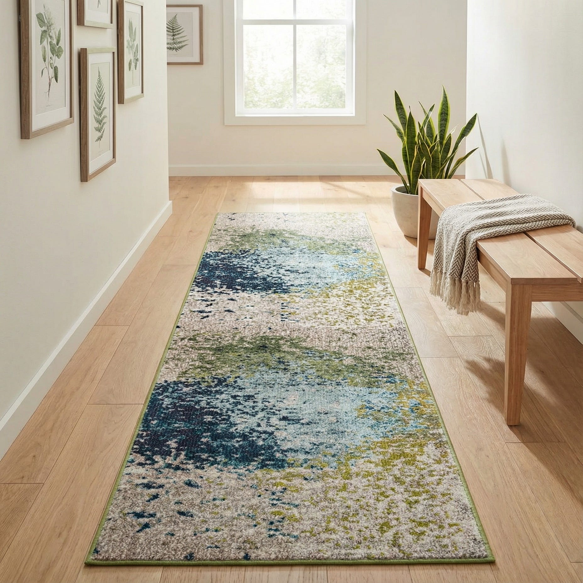 An abstract, painterly runner with a blue background, this machine-made piece in 100% polypropylene layers navy blue, light blue, green, gray and pops of yellow into a mottled, watercolor-like pattern. Darker navy and teal clusters anchor the composition while softer blues and mossy greens diffuse outward, creating a dynamic yet balanced look. The design reads contemporary with a subtle transitional sensibility—artful color washes rather than strict geometric repeat.