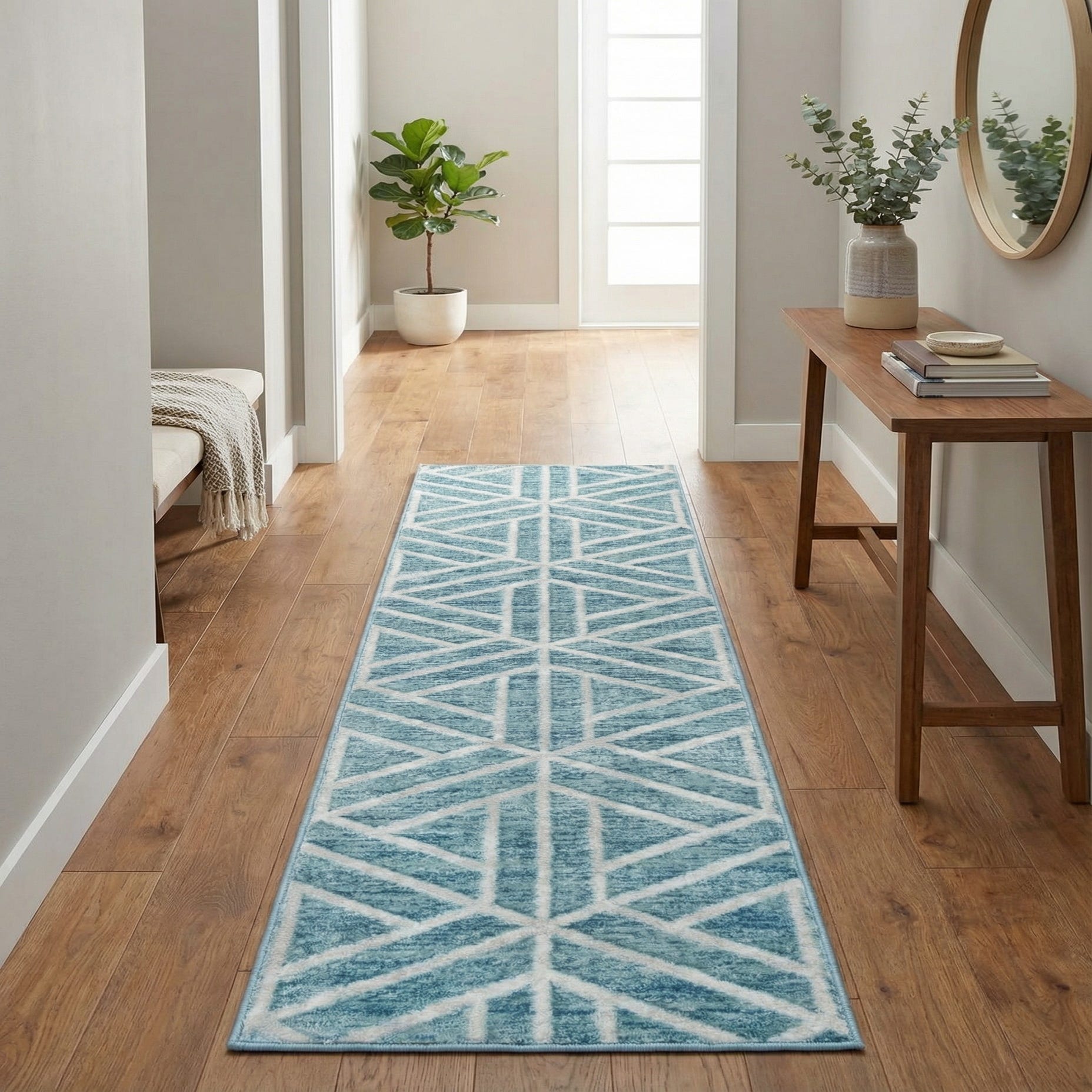 Machine-made from 100% polyester, this runner layers easily in long, narrow spaces where you want color and pattern without overwhelming the room. It suits contemporary and transitional interiors as well as coastal or casual-modern schemes—place it in a hallway, entry, kitchen corridor, or alongside a bed to anchor a bedside vignette. Pair it with light to medium wood tones, white or ivory trim, and simple, streamlined furnishings to let the geometric motif provide visual interest.