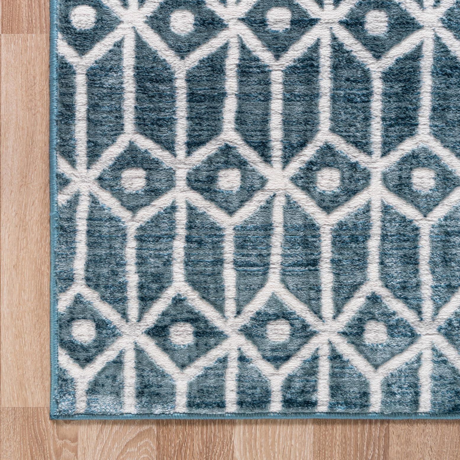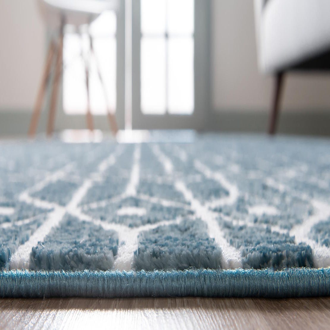 A crisp ivory lattice pattern weaves across a blue background in a repeating geometric trellis of elongated hexagons and small diamond motifs. Machine-made from 100% polyester, the pile has a soft, low-to-medium height with slightly raised ivory outlines that give the rug a subtle dimensional quality. The surface feels plush underfoot while the structured pattern keeps the look clean and modern-traditional at the same time.