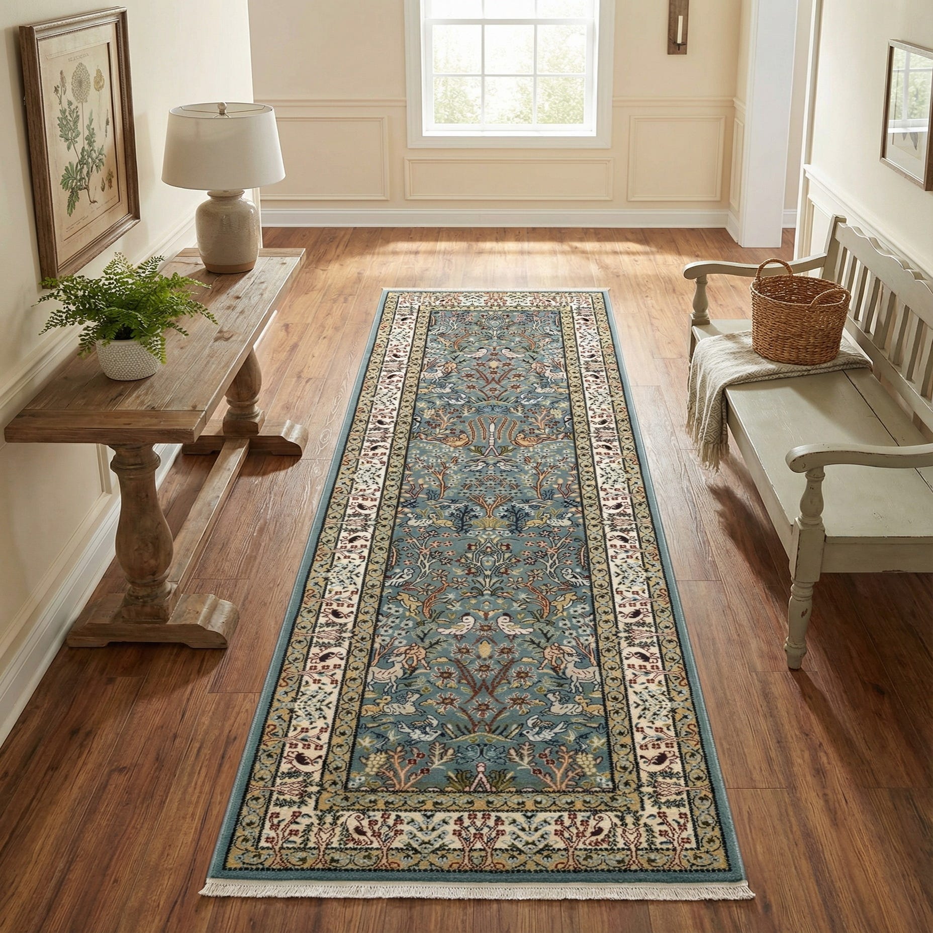 Ideal for hallways, entryways, or beside a long sofa, this runner pairs nicely with warm wood floors, brass or aged-metal lighting, and upholstery in cream, navy or muted green. It complements traditional and transitional interiors as well as more eclectic spaces that mix antique pieces with modern accents, and it sits well under narrow console tables or in a kitchen corridor where a decorative yet structured floor element is desired.
