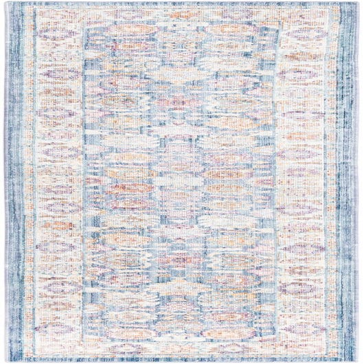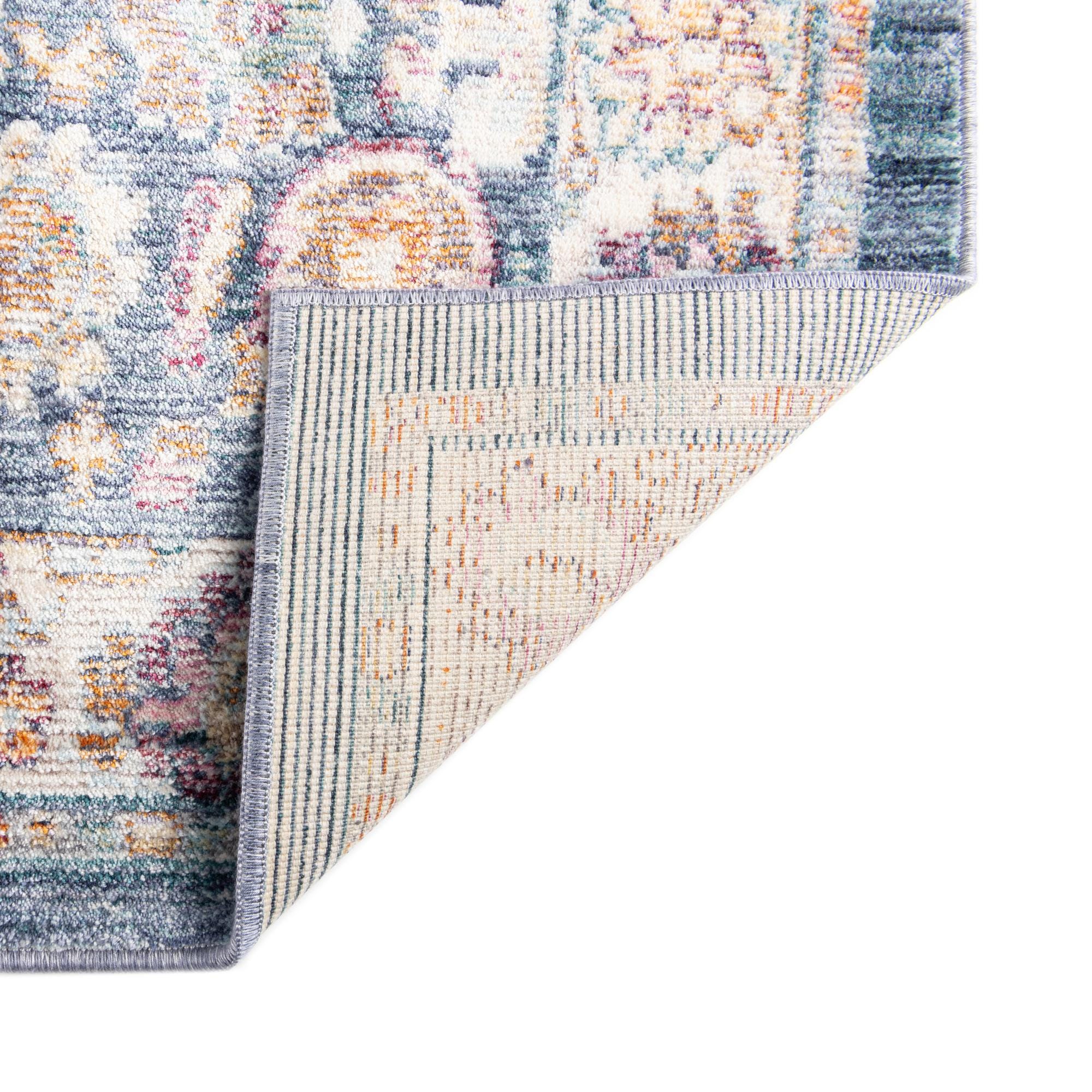 Primary color is Blue. Colors in this rug include: Blue, Ivory, Violet, Orange, Light Blue, Navy Blue.
