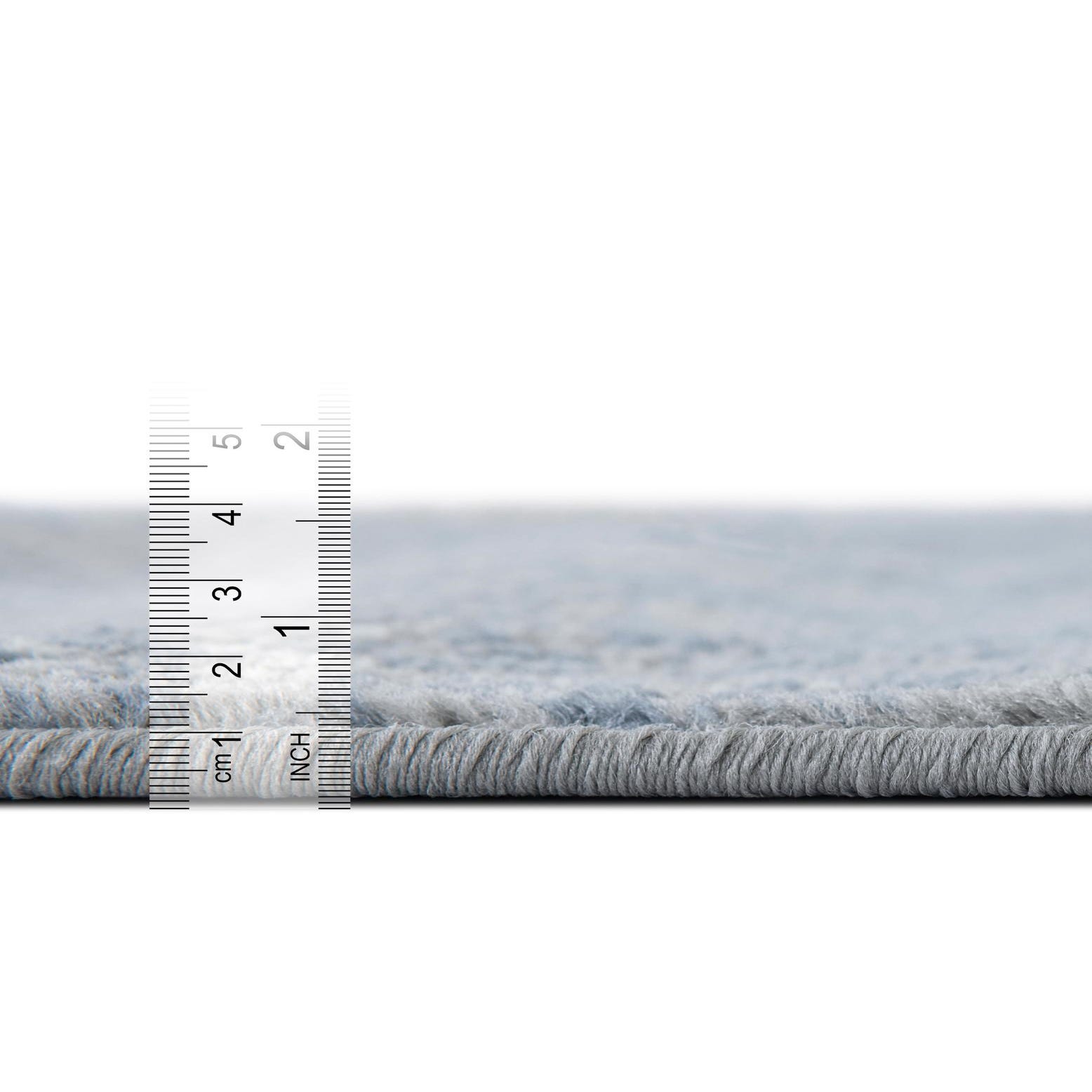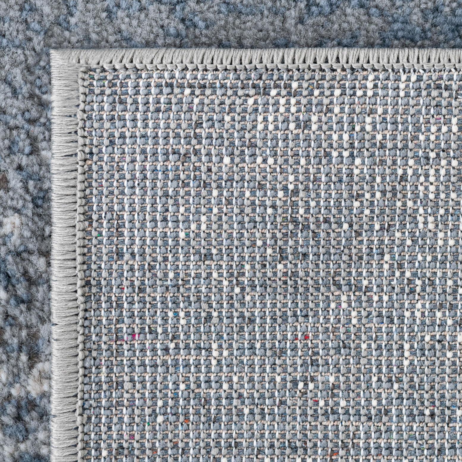 Primary color is Blue. Colors in this rug include: Blue, Gray, Ivory.
