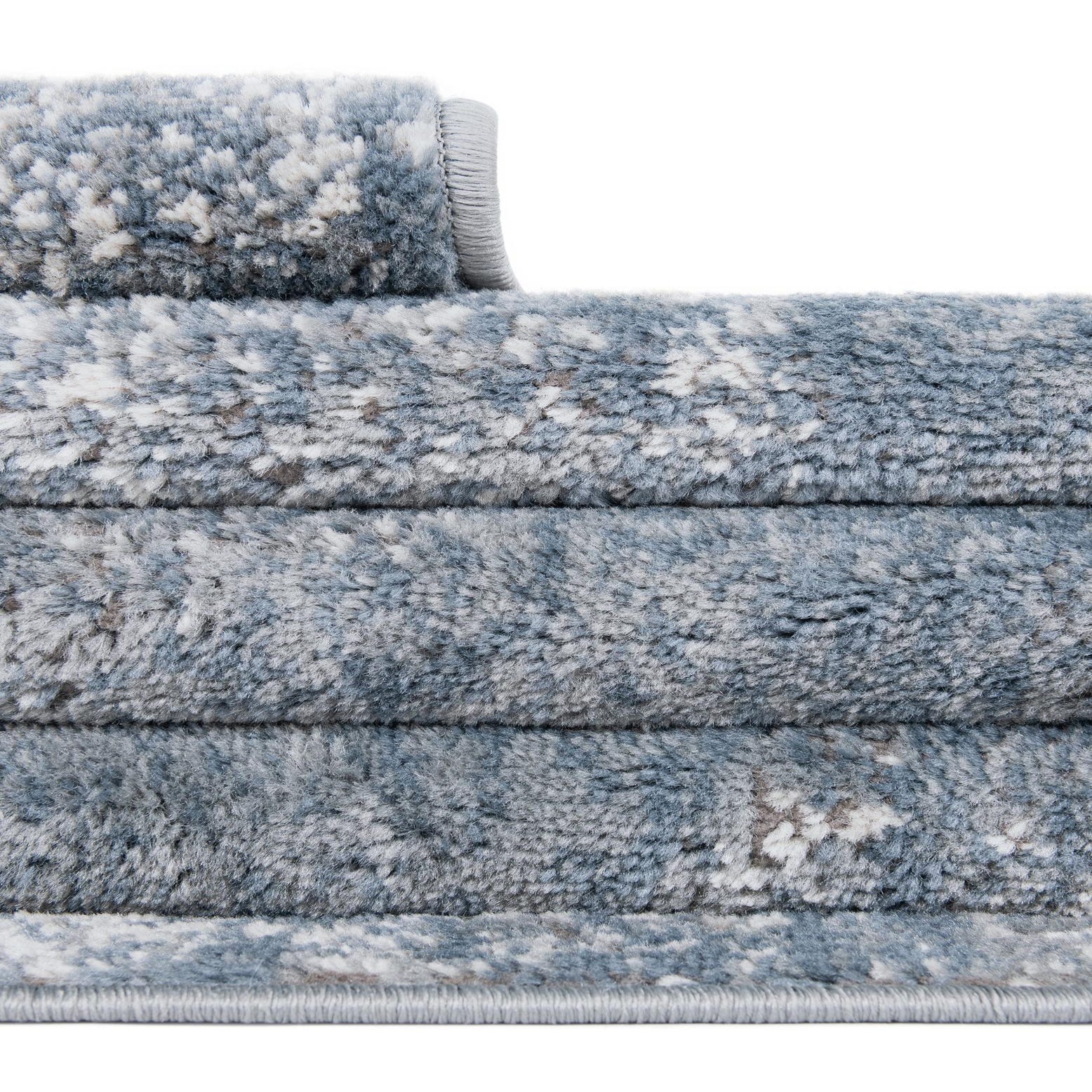 A soft, low-pile runner with a worn, vintage-inspired motif, this piece shows a faded medallion pattern worked into a mottled field. The background is blue, punctuated by ivory highlights and gray tonal variations that create depth without a high-contrast look. A subtle, tonal border frames the design, and the overall effect reads as quietly layered and textural—ivory speckling lifts the darker blue while gray tones add a muted, contemporary feel.