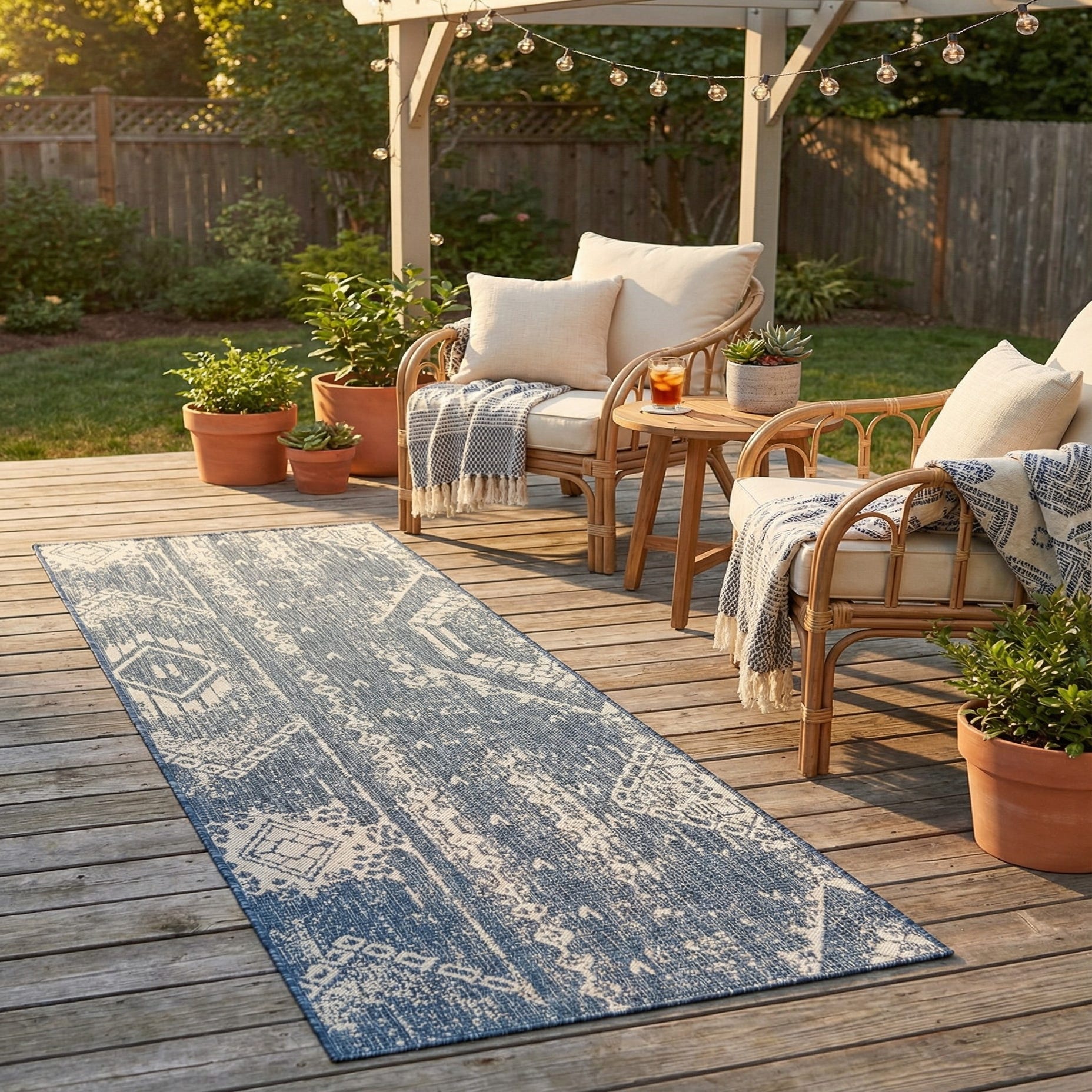 A blue and white modern bohemian runner rug with geometric patterns, suitable for a hallway or patio.