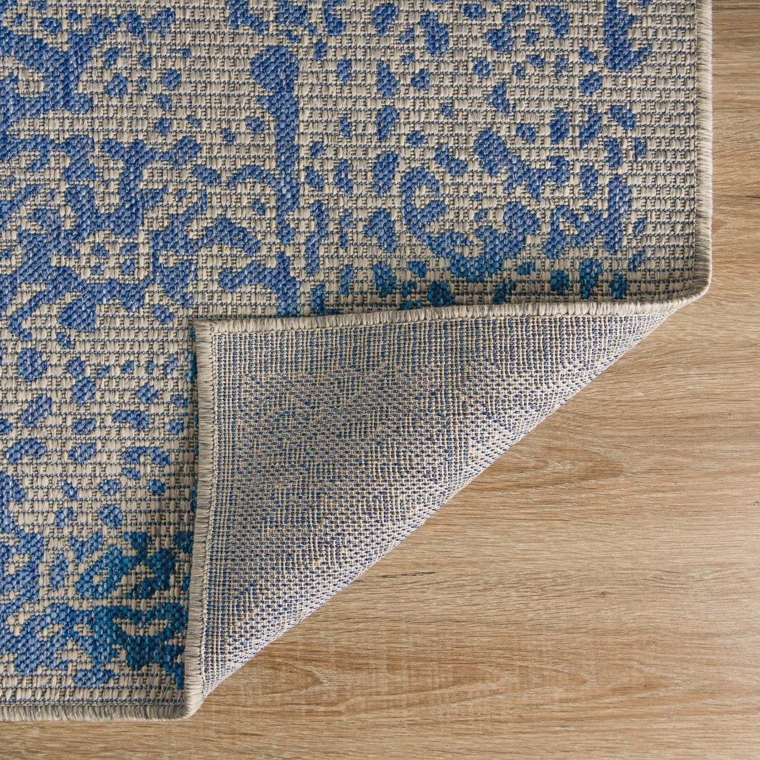 As a runner, this style works well in entryways, narrow hallways, galley kitchens or covered porches where you want pattern and definition without heavy pile. Pair it with light wood floors and white or gray trim for a coastal or transitional scheme, or combine it with painted navy cabinetry and natural-finish furniture for a modern farmhouse touch. The muted blue background and gray detailing make it easy to layer with patterned pillows, woven baskets or simple metal accents.