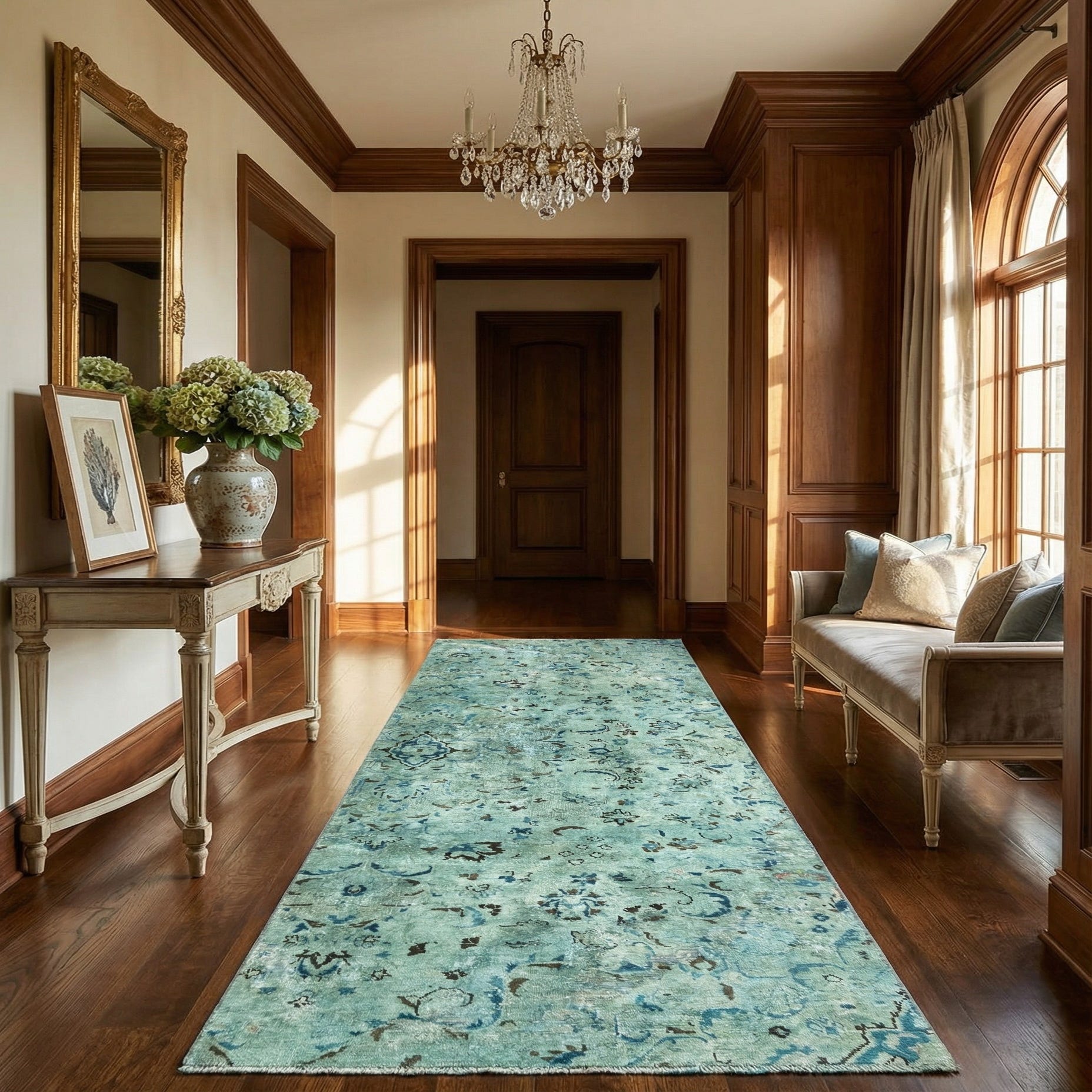 A handmade 8 ft runner rug from the Vintage Royal collection, featuring a distressed blue vintage pattern.