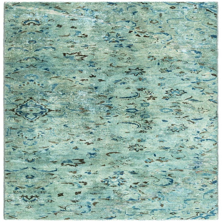 A vintage-inspired runner with a worn, antique wash and a softly distressed floral pattern. The blue background anchors the design while light-blue highlights and brown accents trace faded medallions, scrolling vines and scattered rosettes across the field. Hand made of wool, the surface has a gentle, velvety pile and a subtle luster that you can feel underfoot—soft and tactile without being overly plush.
