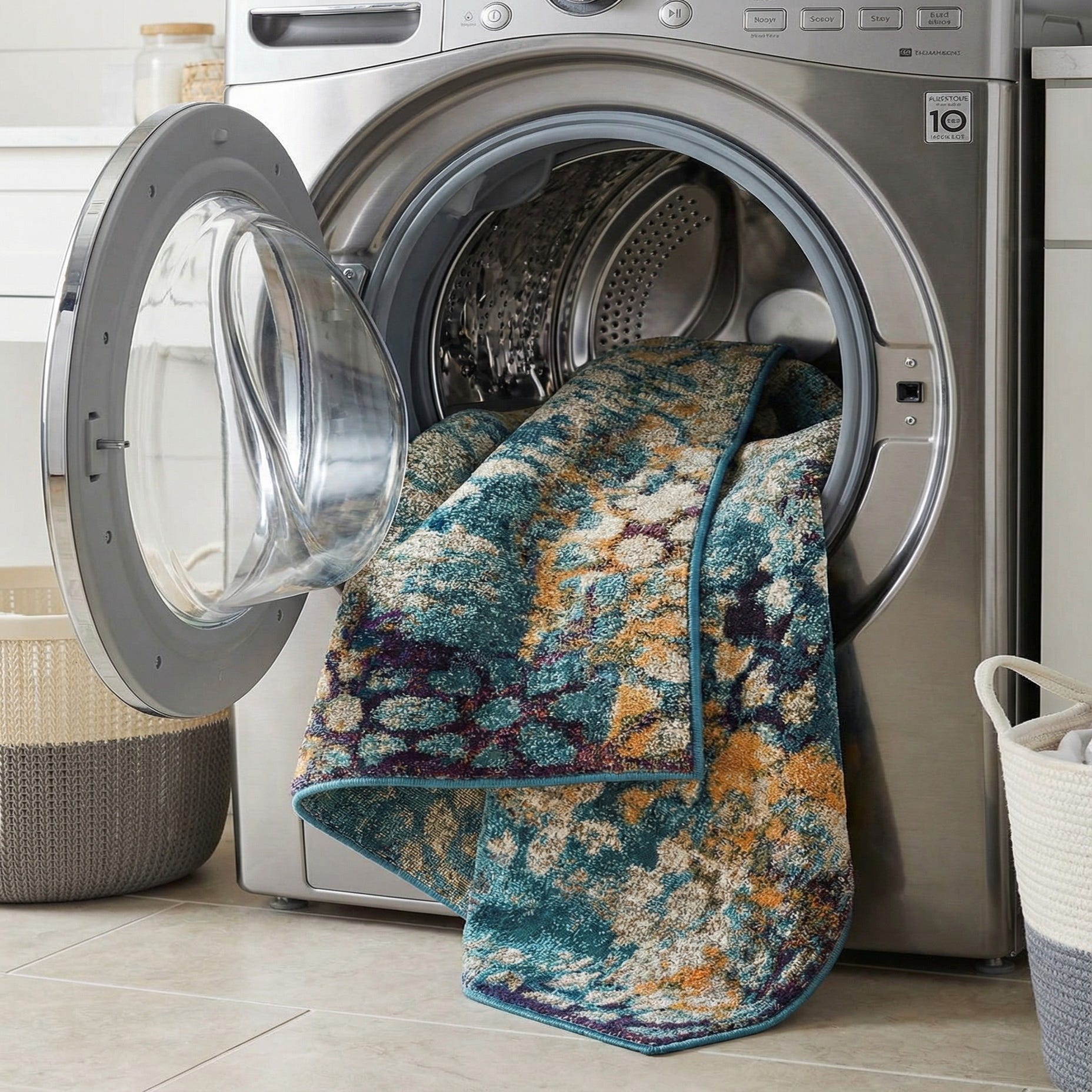 Place it beneath a seating group to anchor a living room, or layer it under a bed to add color and texture to a bedroom. It pairs naturally with warm wood furniture and brass or matte black accents, and also complements coastal, mid-century modern, or eclectic interiors that mix solid upholstery with patterned pillows and woven textures. The rug’s color palette makes it easy to coordinate with navy sofas, neutral linens, or accent pieces in orange and green for a cohesive, lived-in feel.