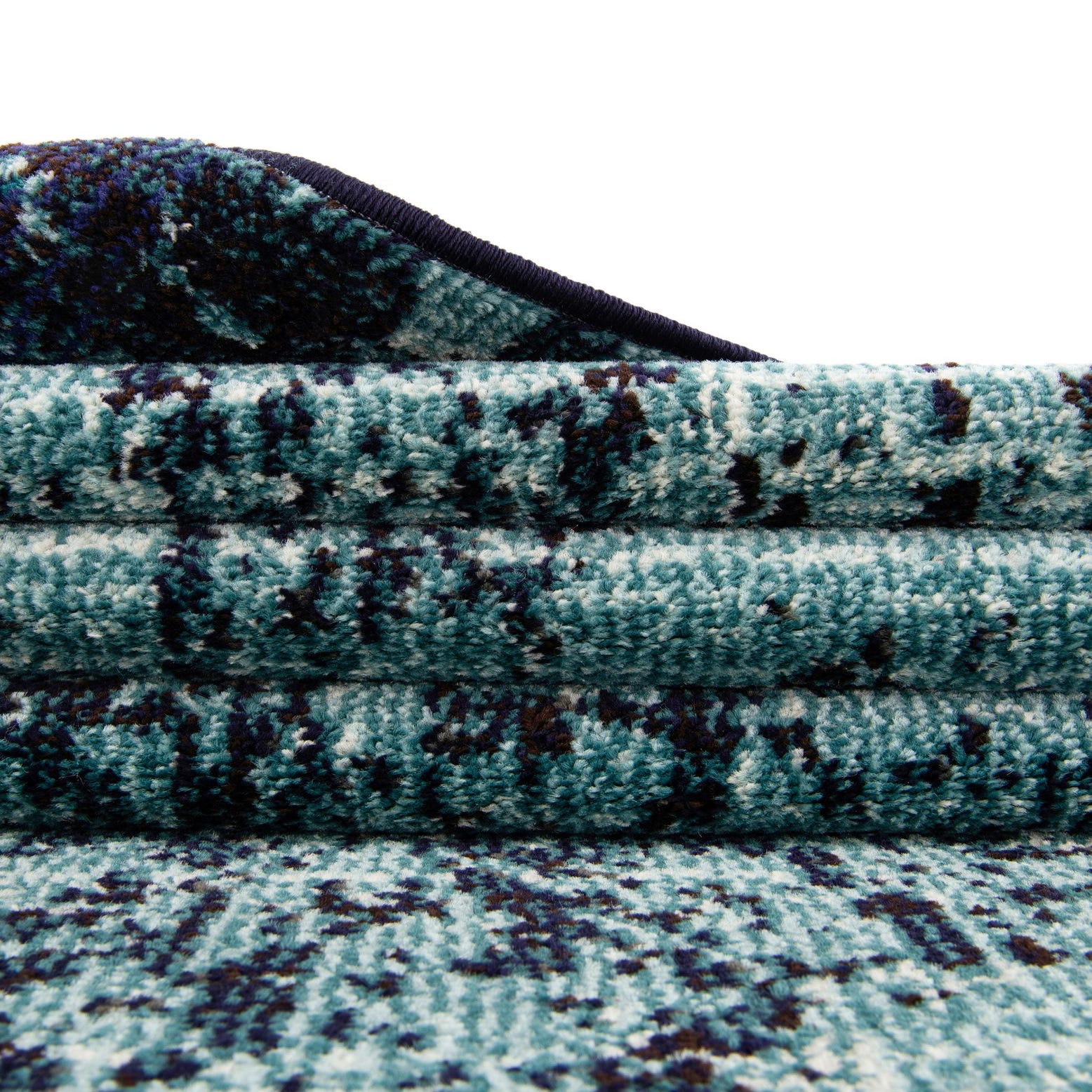A layered floral medallion pattern sits on a blue ground, where light blue and ivory highlights lift the design and navy accents trace the motifs for added depth. The overall look blends traditional Oriental-inspired ornament with a deliberately distressed finish, so the floral scrolls and corner roundels read like a vintage piece that’s been gently faded over time. The border is softened into the field for a cohesive, worn-in appearance that keeps the pattern from feeling overly formal.