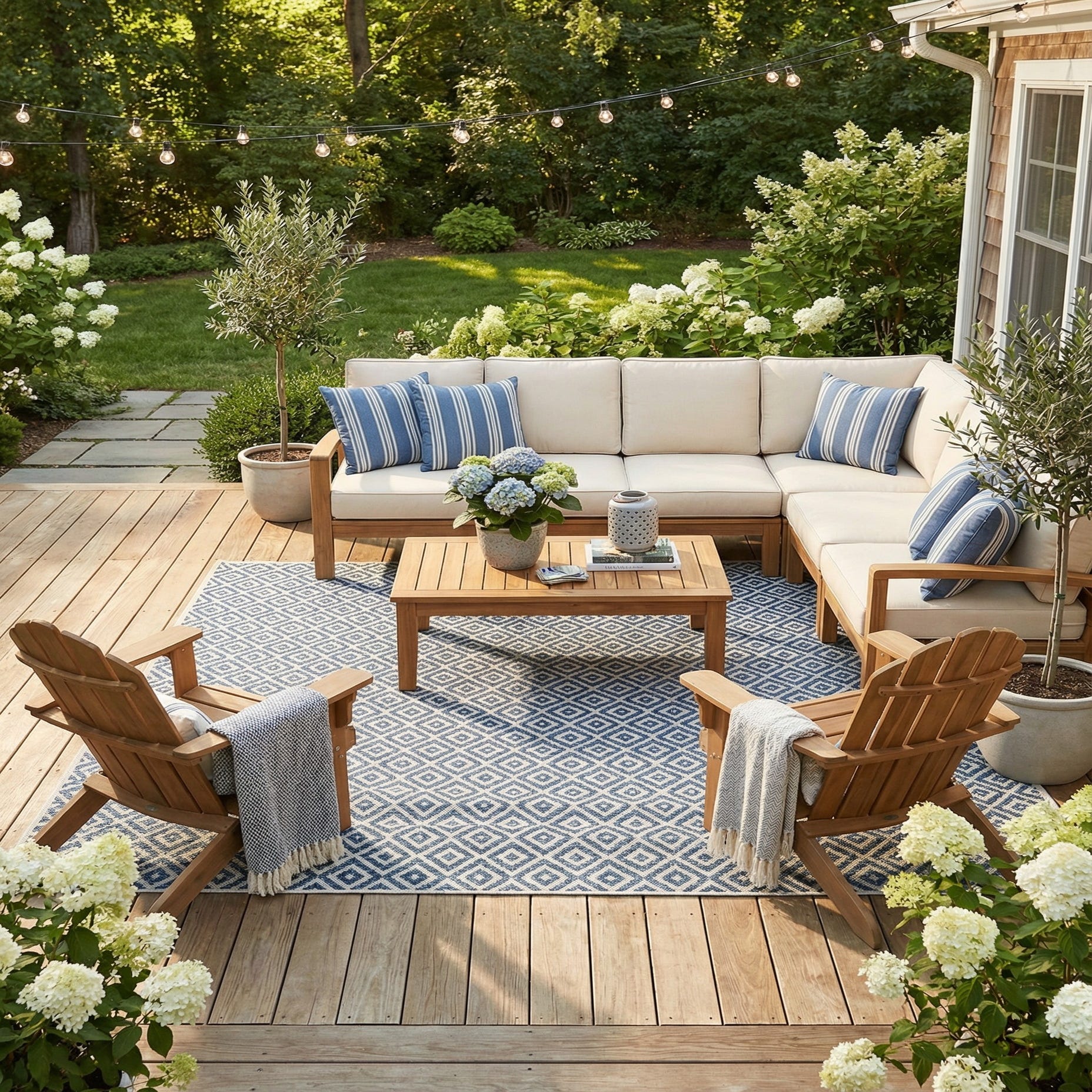This rug works well in covered outdoor rooms, on a porch or poolside terrace, and also translates smoothly into indoor spaces such as a sunroom, casual living area, or entryway. Pair it with natural wicker or teak furniture and crisp white cushions for a coastal look, or layer it under a simple dining set to introduce pattern and color without overwhelming a neutral palette.