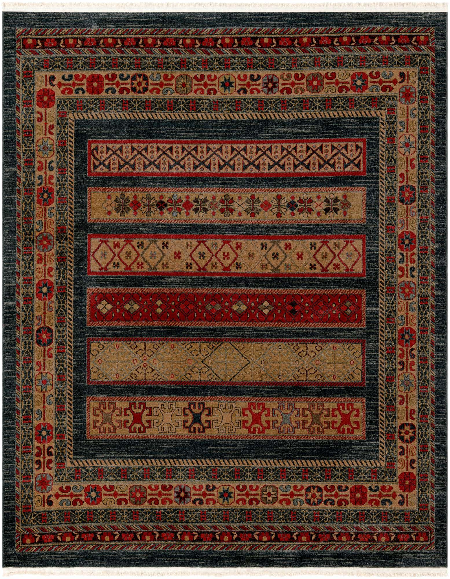 Primary color is Blue. Colors in this rug include: Blue, Light Blue, Light Green, Red, Tan.