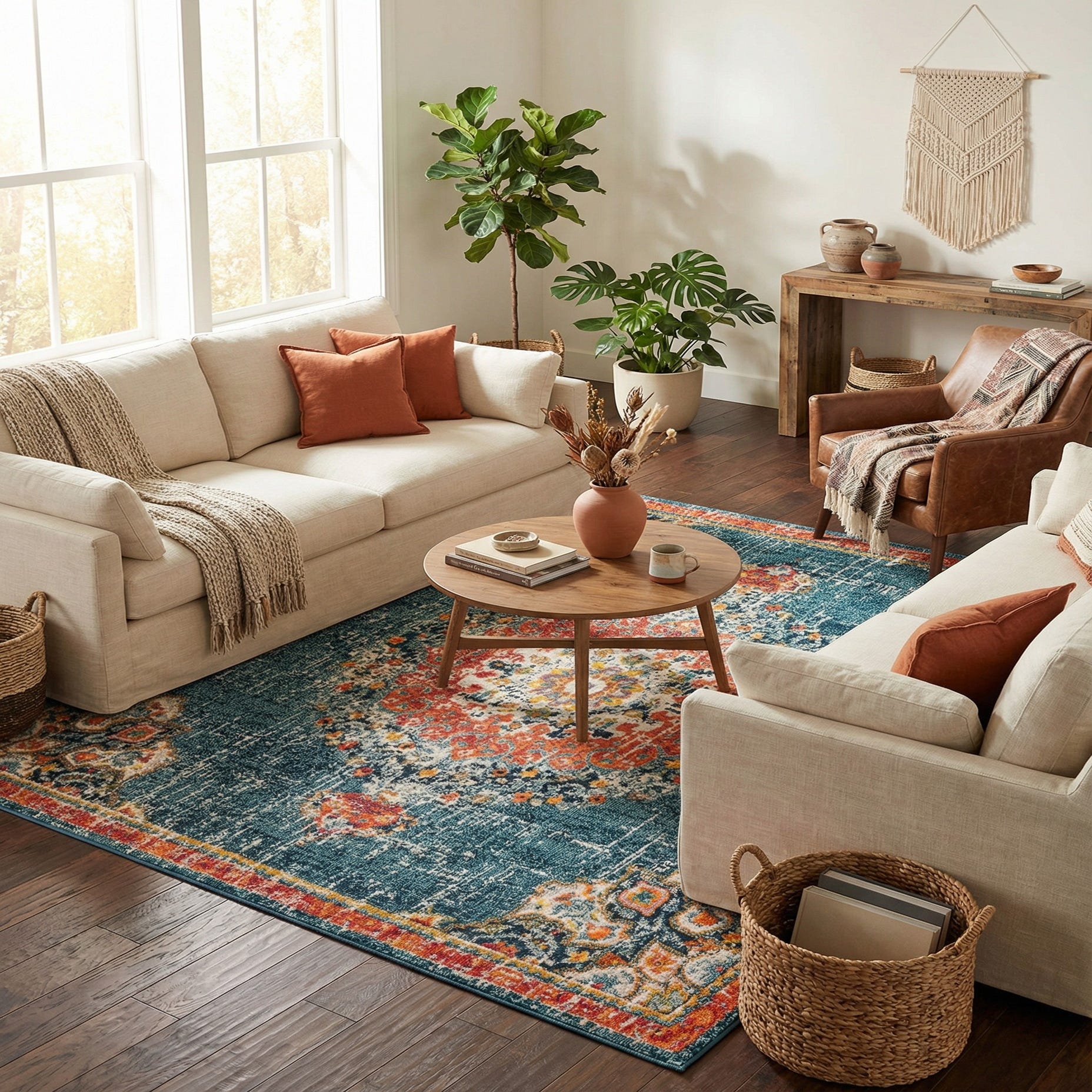 Machine made of 100% polypropylene, this rug has a low, dense pile with a soft hand and a subtle sheen that looks textured underfoot. The clear pattern definition and distressed finish make it a versatile anchor for a number of settings: place it under a sofa and coffee table to warm a living room, under a dining table to ground a seating area, or layer it in a bedroom to introduce color and pattern. It pairs nicely with warm wood furniture and ivory textiles for a relaxed yet refined look, or with navy upholstery and brass accents for a more tailored, collected feel.