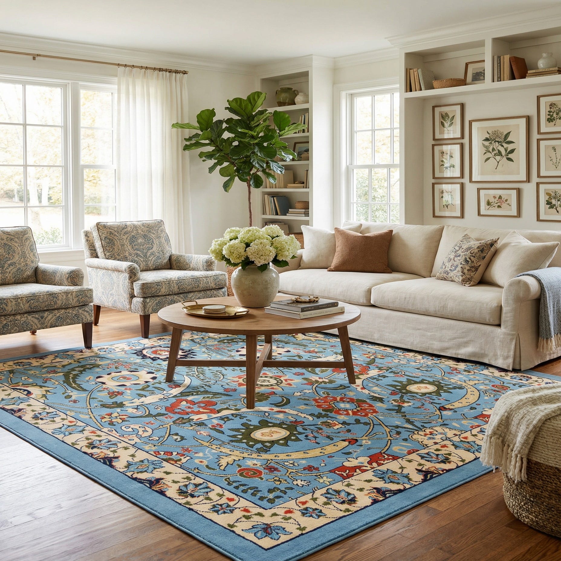 Machine-made from 100% polypropylene, the rug has a low, even pile with a smooth hand that delivers crisp pattern definition and a comfortable underfoot feel. It works well as an anchor for a living area beneath a sofa and coffee table, under a dining table to add pattern to a neutral floor, or layered in an entry or bedroom to introduce color and structure. Pair with natural wood tones, cream or navy upholstery, terracotta accent pillows and leafy green plants to echo the rug’s palette; matte black or brass hardware will pick up the darker outlines and complete the room.