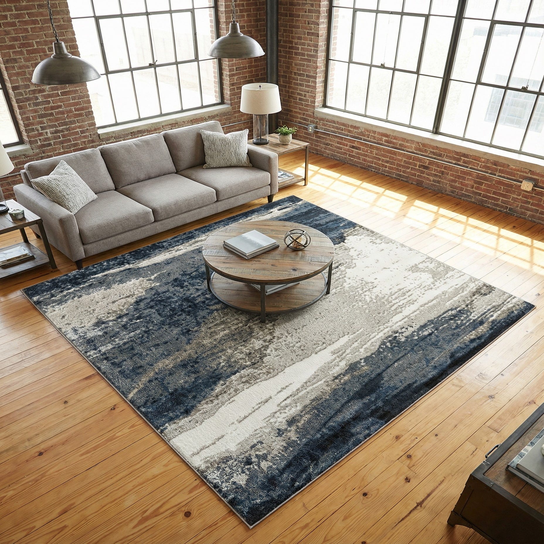 This piece works well as an anchor in contemporary living rooms with neutral seating and navy or charcoal accents, under a bed to add calming color to a bedroom, or in a home office where subtle pattern brings interest without competing with furniture. Pair it with clean-lined furnishings, mixed-metal lighting, and textured throws or pillows to complement the rug’s painterly movement and layered tones.