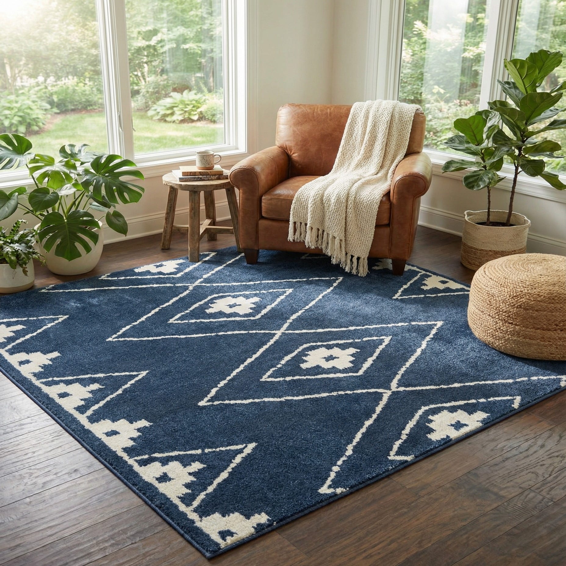 Machine made from 100% polypropylene, this rug holds up well to everyday use and pairs naturally with a range of interiors. It works nicely beneath a coffee table in a relaxed living room, layered in a coastal or nautical scheme with light woods and white linens, or as a grounding element in a modern farmhouse or contemporary apartment with navy accents and metal fixtures. Place it in a reading nook or at the foot of a bed to add both pattern and plush comfort to the space.