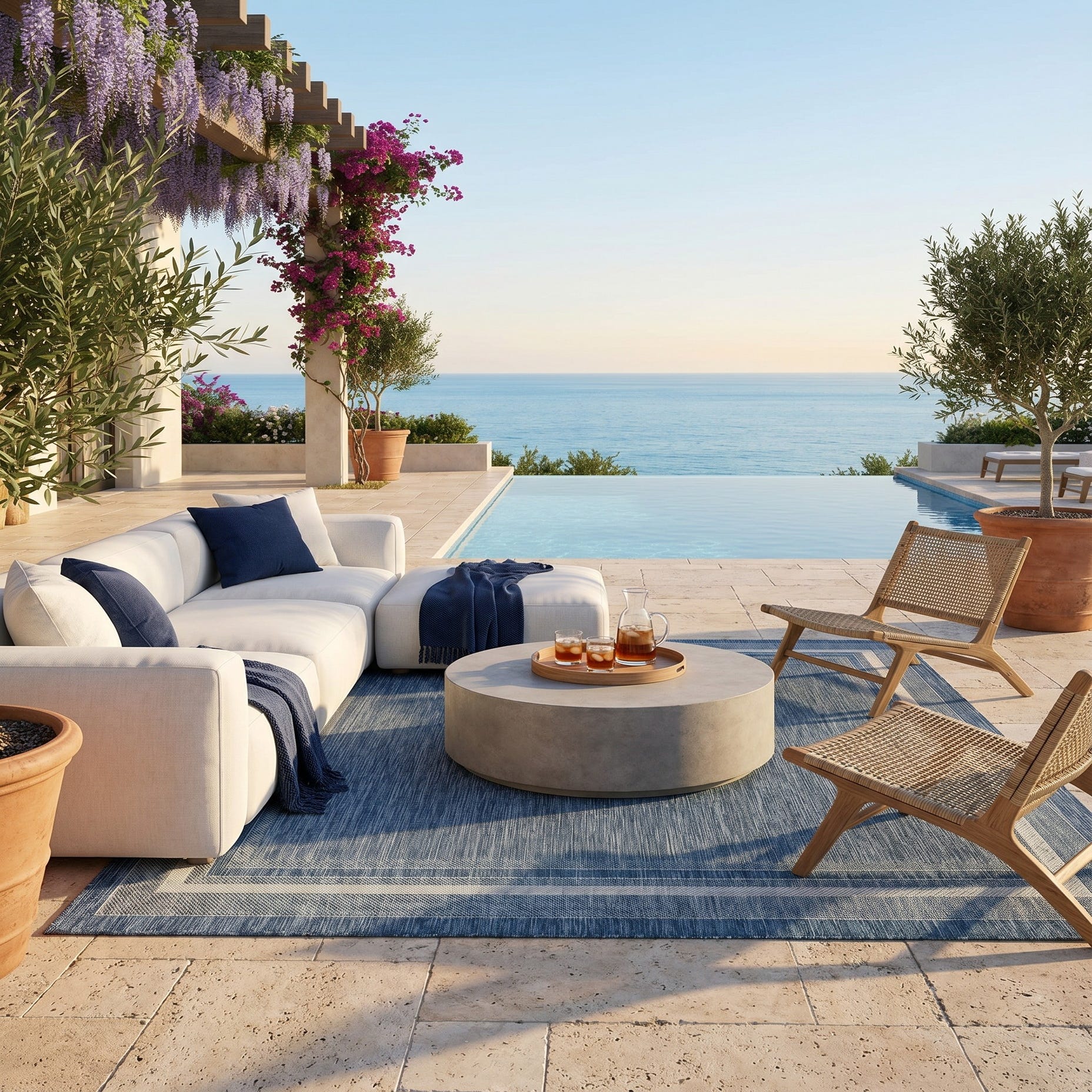 We needed to replace old deck rugs as the old ones had become stained and unsightly over the years. Found this size and pattern and initially wanted the lighter color but it was unavailable. We thought we were settling but turns out this color really enhances our drab concrete deck and looks great with rattan furniture. They came folded not rolled and I was concerned about them flattening out. No problem. They dry quickly after a rain (our old ones took forever) as they are a little lighter (less thick) than old rugs. I was initially concerned about this but don’t expect it to be a problem. Now we just need to see how they weather over the season.