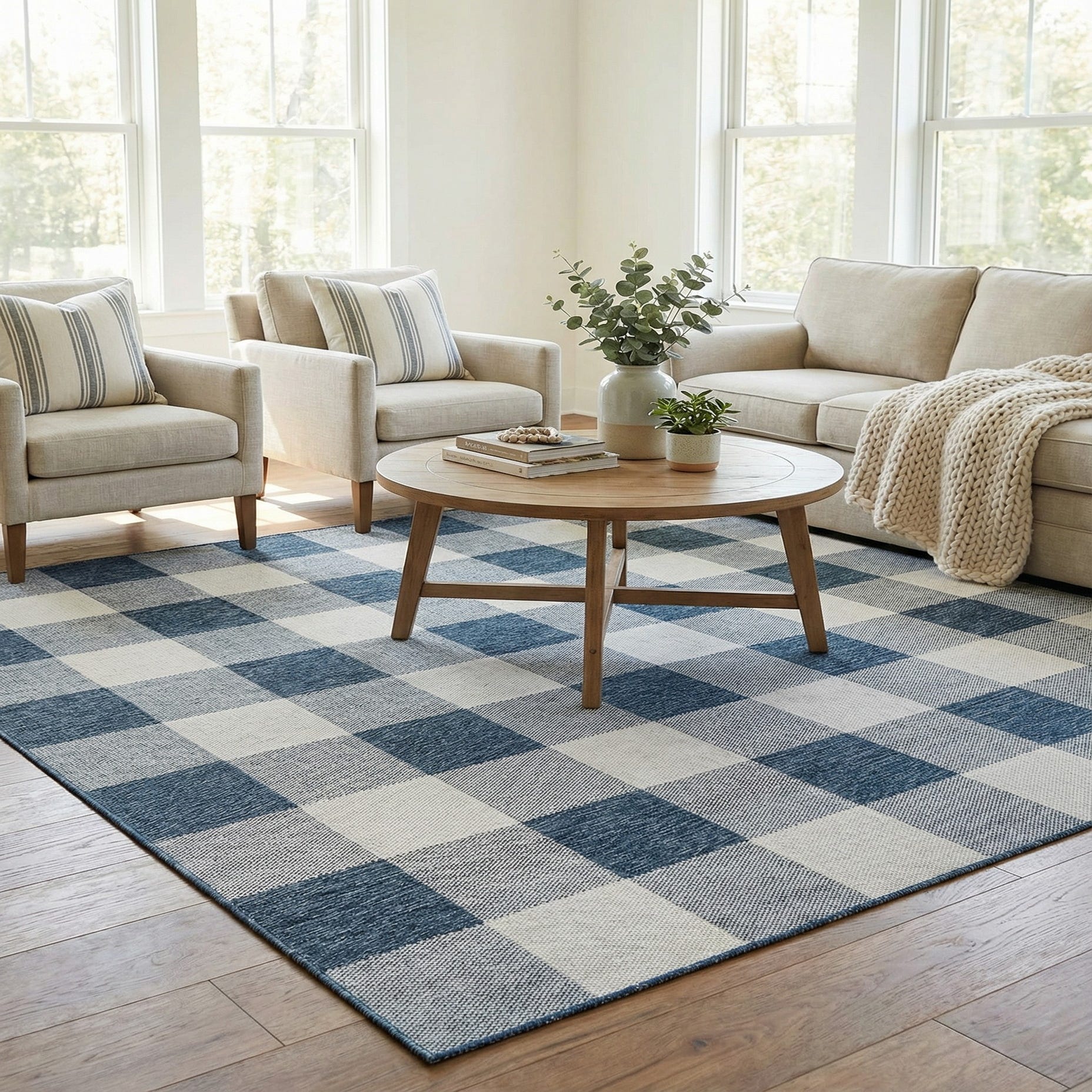 A 7' 10 x 7' 10 square blue and white checkered rug with a modern flatweave pattern, suitable for indoor or outdoor use.