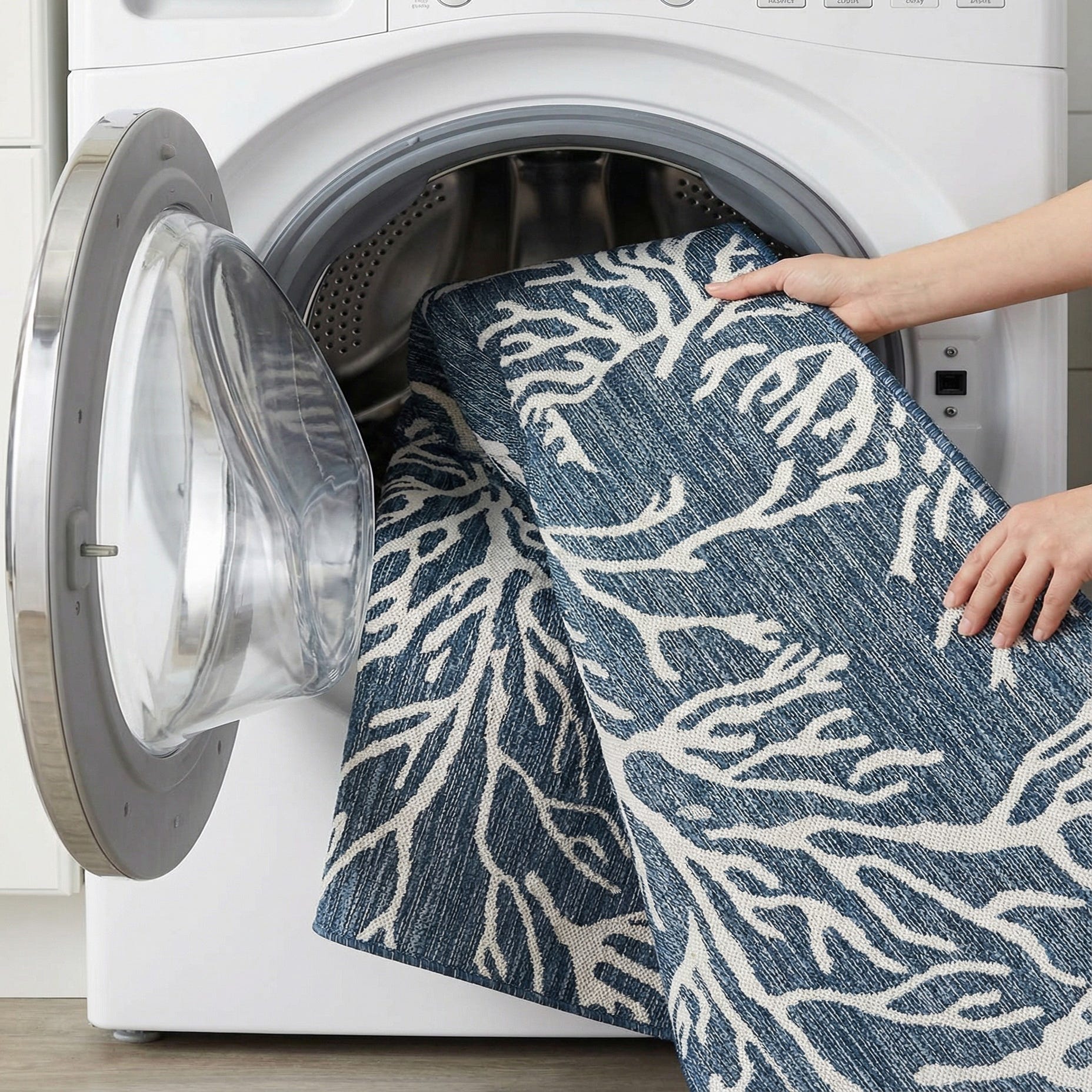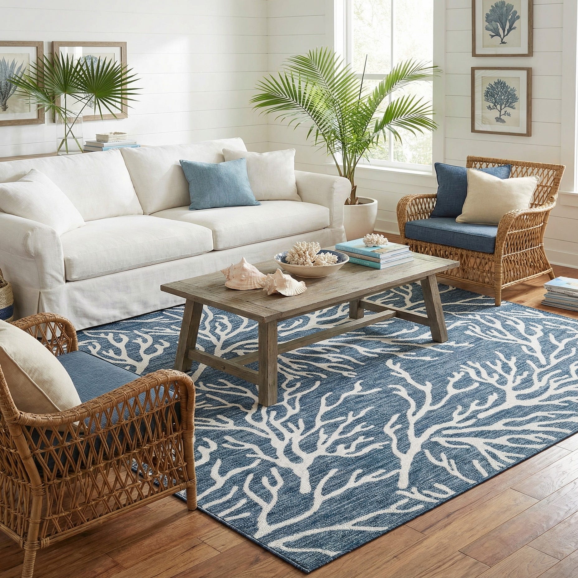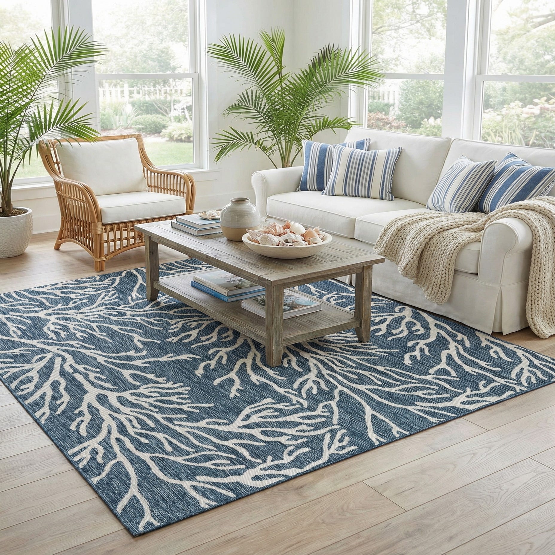 A square blue and white rug with a modern coastal coral pattern, suitable for indoor or outdoor use.